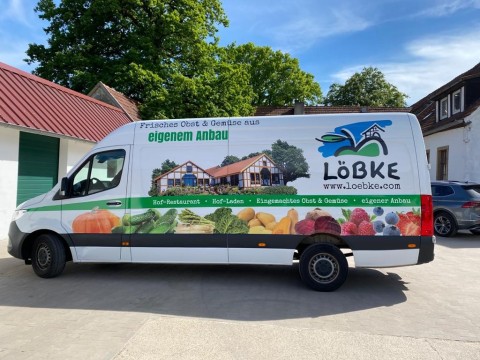Tolle Werbung für den Hof Löbke. Und perfekt in Szene gesetzt auf den großen Flächen der unternehmenseigenen LKW und der Sprinter.