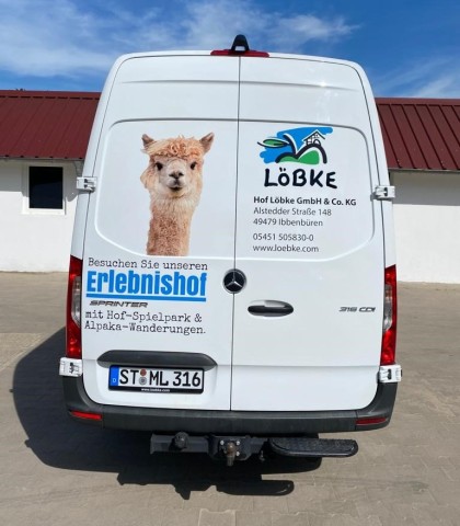 nein, nicht das Murmeltier, sondern ein Alpaka. Jedenfalls bei der neuen Fahrzeugbeschriftung für den Hof Löbke in Ibbenbüren. Schön ist es geworden, und dabei auch noch sehr informativ. Insgesamt wurden zwei firmeneigene LKW und zwei Sprinter mit einer hochwertigen UV-Folierung ausgestattet. Auf einer Längsseite der Fahrzeuge wird der Obst- und Gemüseanbau mit vielen Bildern und einem grünen Textrahmen beschrieben, die andere Seite wirbt analog in Blau für die Hof Manufaktur. Zur Hof-Manufaktur zählen das Restaurant und der Hofladen mit seinem umfangreichen Sortiment.