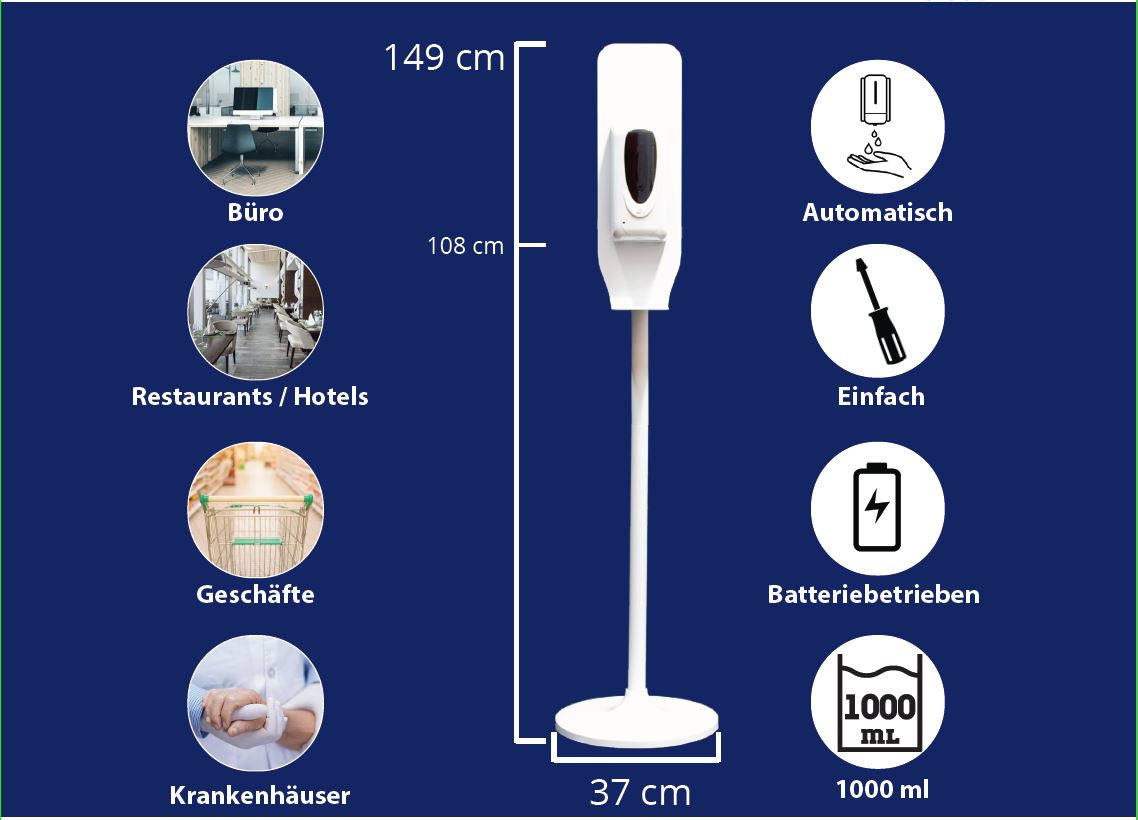 Mobil einsetzbare Desinfektionssäule mit kontaktlosem Desinfektionsspender.