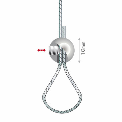 schlaufenklemme für seil. stahlseil oder nylonschnur zur schlaufe durchschieben und mit madenschraube sichern. befestigung: schlaufenklemme für seil, schraubsystem. material: messing verchromt. seilstärke: max. Ø1,8mm. chrom