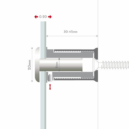 Halter an der Wand befestigen, Wandabstand durch aufschrauben der Mittelhülse wie gewünscht einstellen, Schild auflegen, Kopf durch das Schild in den Halter stecken und mit seitlicher Madenschraube gegen Manipulation sichern. Vor allem zum Ausgleich bei unebenen oder schrägen Wänden empfohlen.