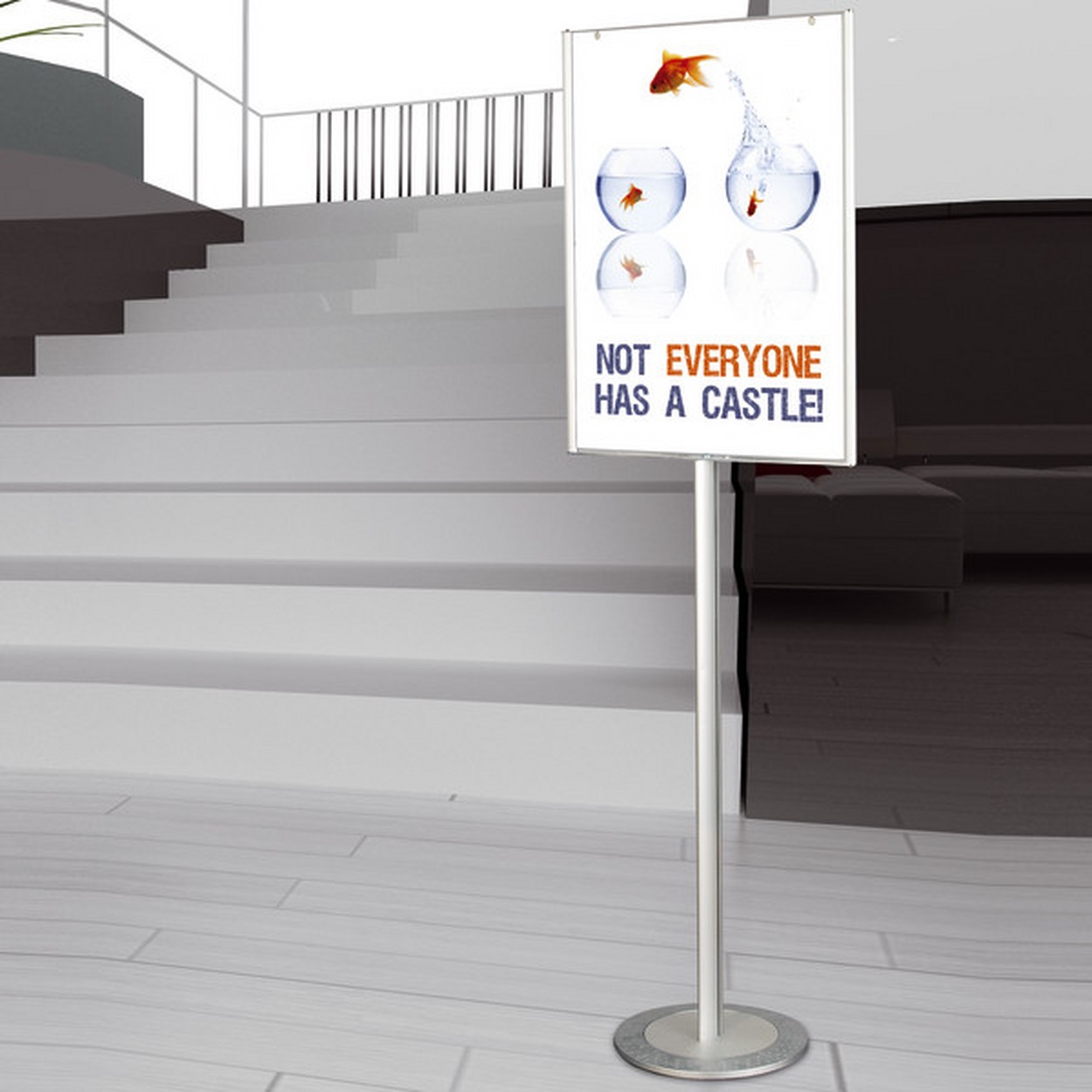 Stabiles Infodisplay mit doppelseitiger Postertasche in transparentem Acrylglas. Durch die bewährte Verschlusstechnik mit Magnet ist der Informationsaustausch jederzeit unproblematisch.