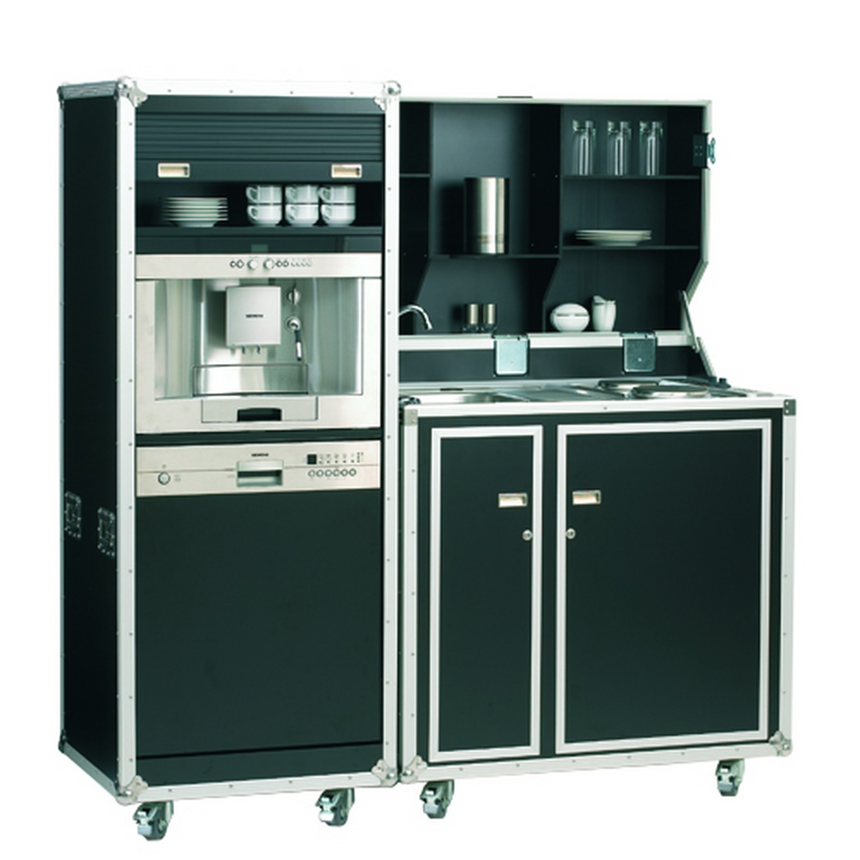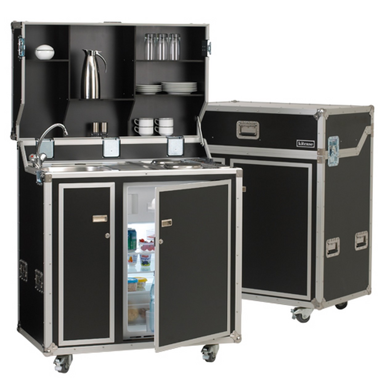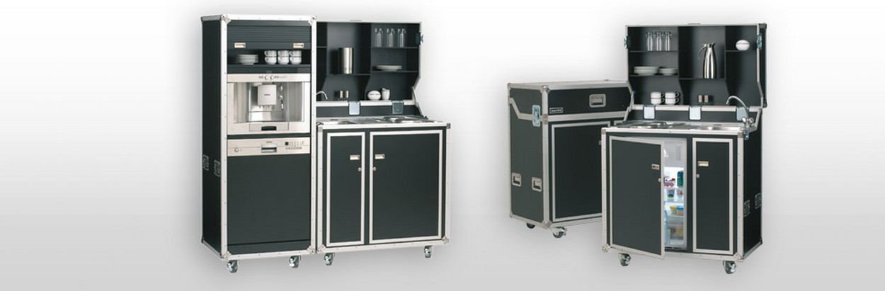 Eine komplette Küche, die in einem Koffer untergebracht ist! Die Kofferküche Kitcase ist eigentlich viel zu schade, um sie hinter den Kulissen Ihres Messestandes zu verstecken. Auch an vorderer Front ist sie garantiert ein werbewirksamer Hingucker! Aber auch in ihrer Funktion als reine mobile Küche ist sie ihren Preis wert. Kitcase ist eine voll funktionsfähige Küche, die aus einer 9 mm Multiplex-Platte gefertigt wurde. Sie ist beidseitig schwarz beschichtet und mit folgenden Geräten ausgestattet: