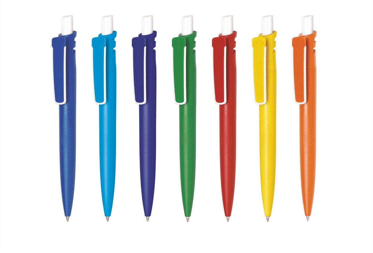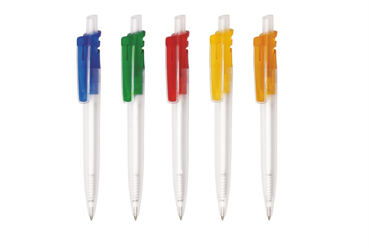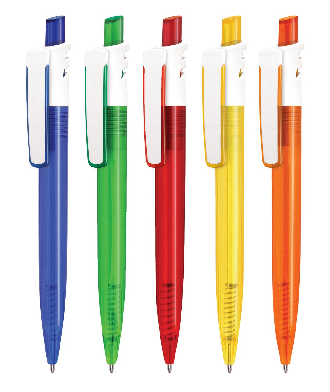 Grand Bright: Farbig-transparenter Schaft, Druckknopf und Lasche, weiß-transparenter Clip