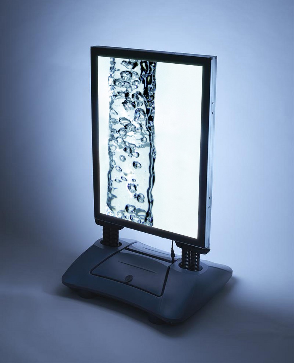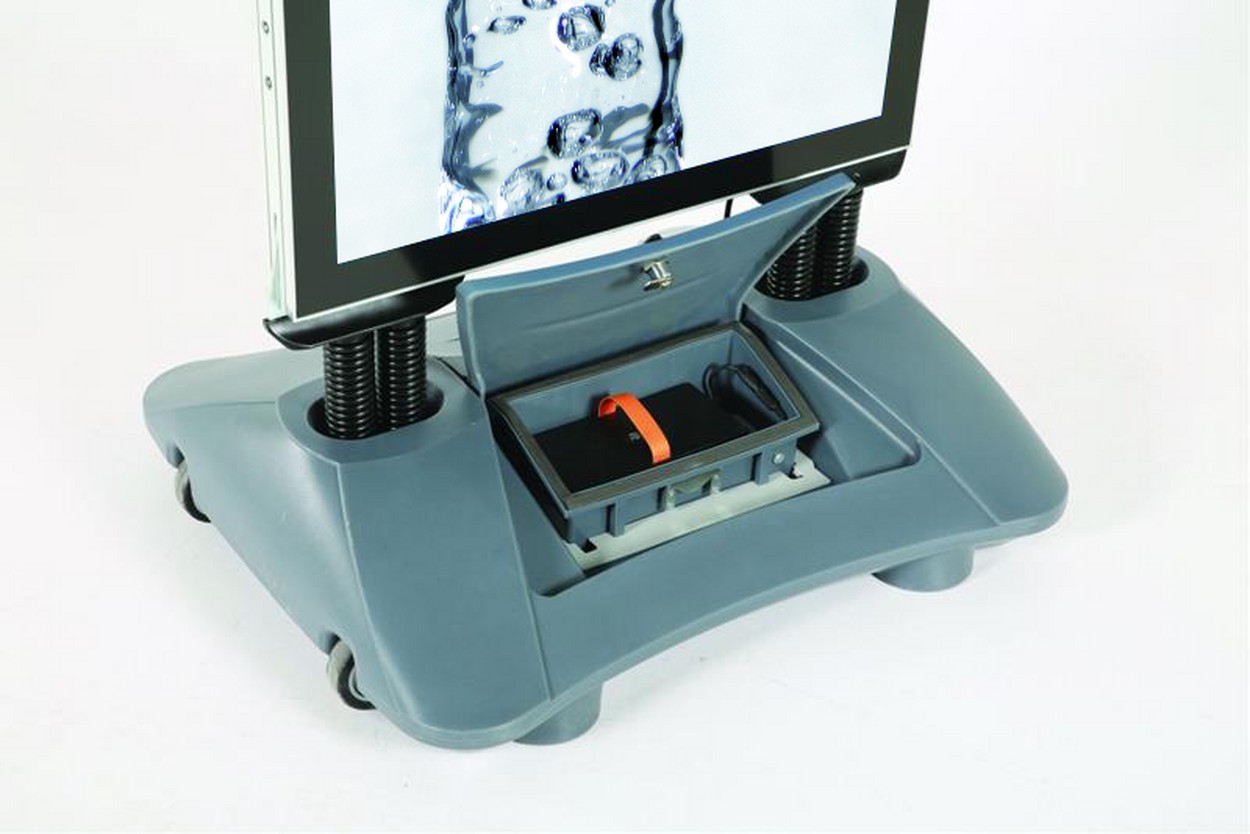 Der Leuchtmodus kann bei diesem Kudenstopper den Lichtverhältnissen angepasst werden. Die leistungsstarke Lithium-Eisenphosphat Batterie ist unsichtbar im Kunststoff-Fuß verschlossen. Der Ladezustand ist durch eine digital Anzeige ersichtlich. Er ist für den Außeneinsatz mit einem befüllbaren Kunststoff-Sockel ausgestattet, dessen platzsparende Form ihn für die Aufstellung in Fußgängerzonen und auf Laufwegen prädestiniert. Dank integrierter Laufrollen lässt sich sein Standort jederzeit neu wählen. Der dekorative, schwarze Rahmen des Kundenstopper Windmaster Pro LED ist abschließbar, das Plakat wird mit Klemmen fixiert.
