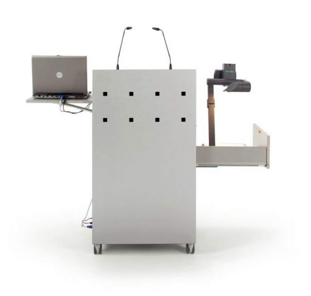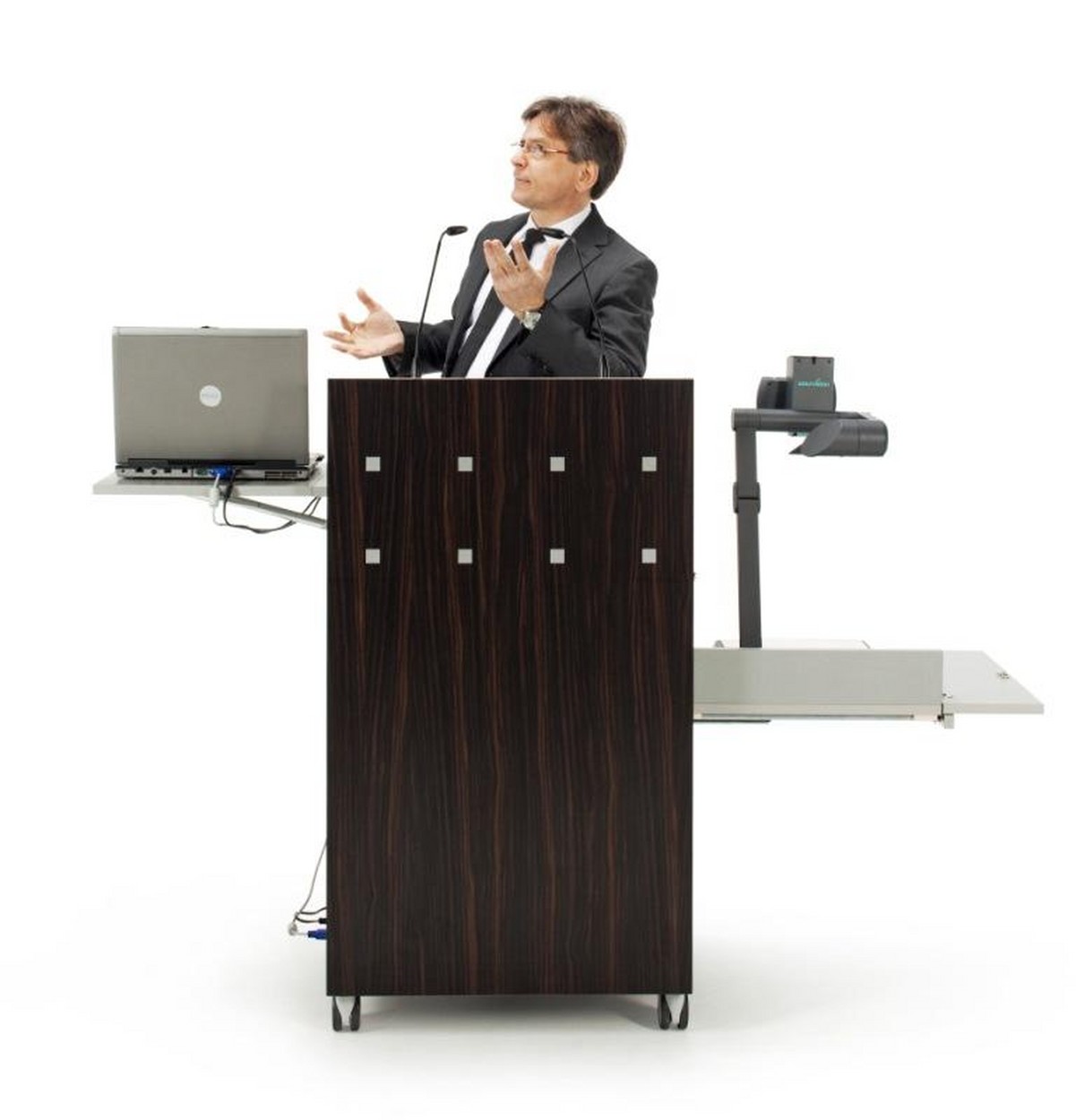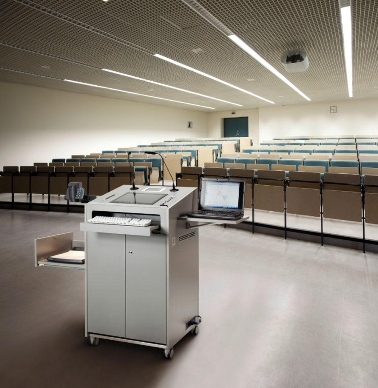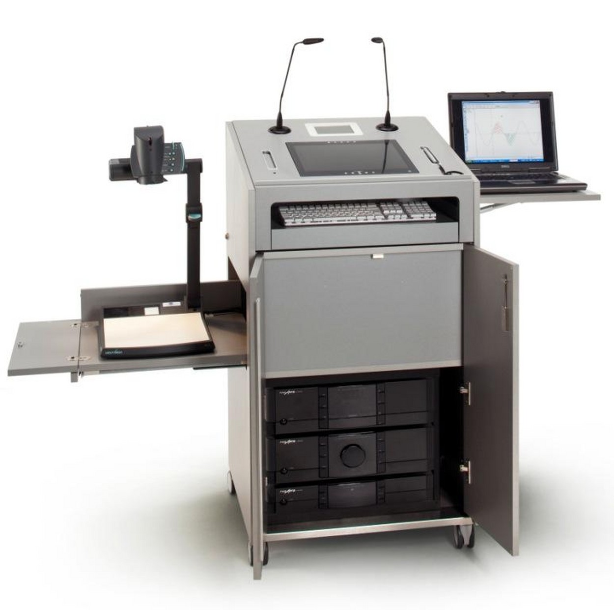 Grundausstattung: 2 USB-Ports, integriertes Anschlussfeld (2 x 230 Volt, 1 x VGA-Audio, 1 x LAN), Leichtlauf-Lenkrollen, Tastaturauszug, Laptopablage / abklappbar, Medienschrank abschließbar