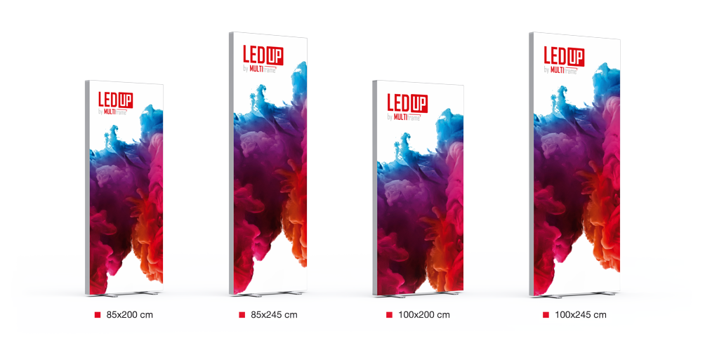 Das mobile Messestandsystem LEDUP besteht aus Einzelmodulen in den Breiten 85 cm und 100 cm und den Höhen 200/202 cm, 230/232 cm und 245/247 cm (alle inkl. Fuß). Das LED-System LEDUP ist aus hochwertig eloxiertem Aluminium gefertigt und das Design ist extrem schlank, stabil, und von zeitloser Eleganz. Für die unterschiedlichen Rahmengrößen werden drei verschiedene Profile (Bautiefe 80, 120 und 160 mm) verwendet. LEDUP ist überraschend leicht. Zum Beispiel wiegt ein Leuchtkastendisplay mit den Maßen 100 x 200 cm nur 8,7 kg.