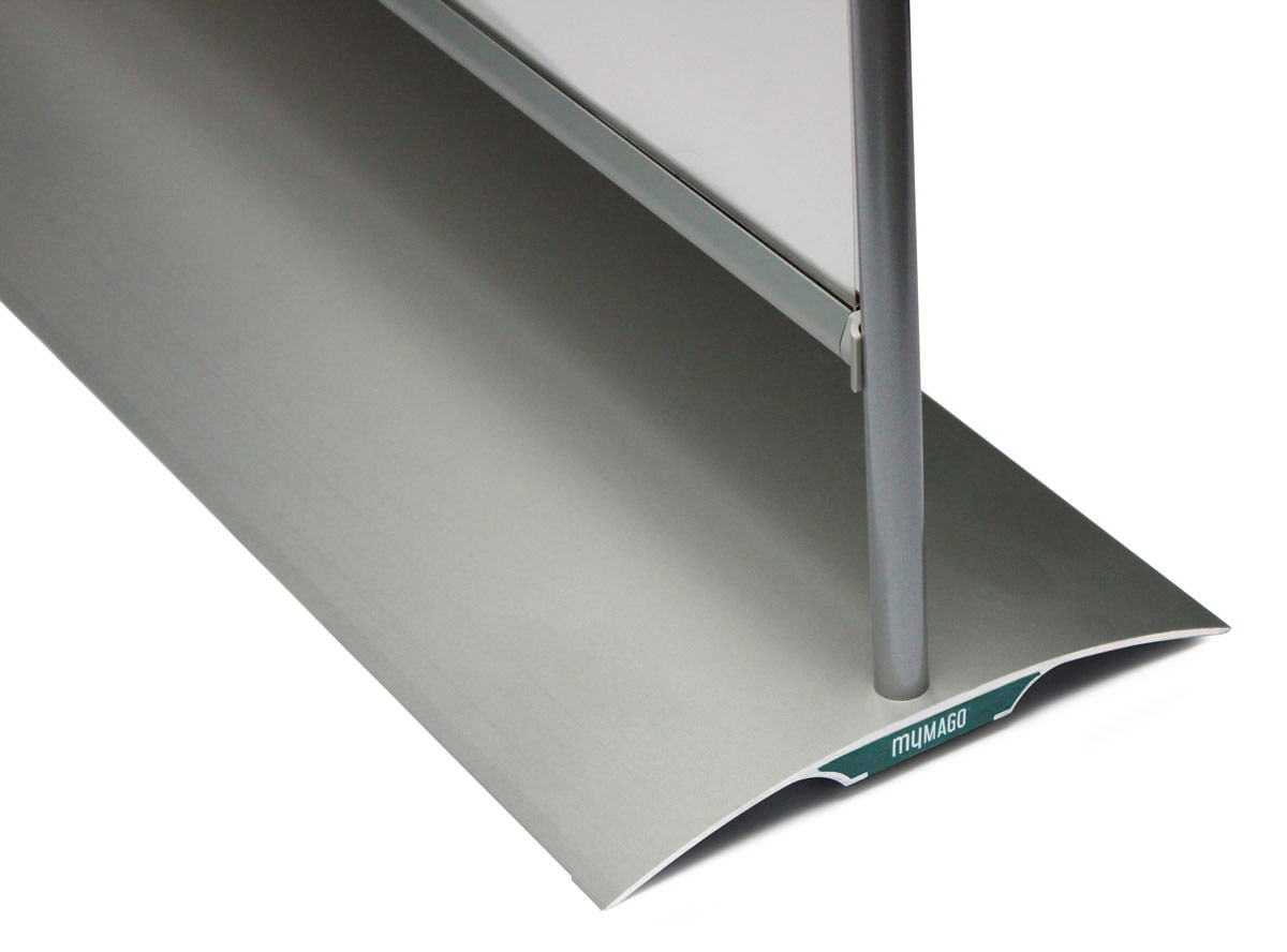 Optional verfügbar ist das MyMago link. Hier wird die Bannerfläche mittels Schiene unterbrochen, so dass eine geteilte Werbefläche entsteht. Auf diese Art und Weise könnten Sie einen Teil der Fläche mit einer glasklaren Folie ausstatten, die andere mit Ihrem Logo oder einem netten Spruch - so kombinieren Sie Ihre Werbeaussagen mit Corona-Schutz!