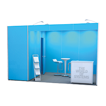 Octawall Messestand als Reihenstand mit Blende und abschließbarer Kabine als separater Beratungsraum oder Abstellraum.