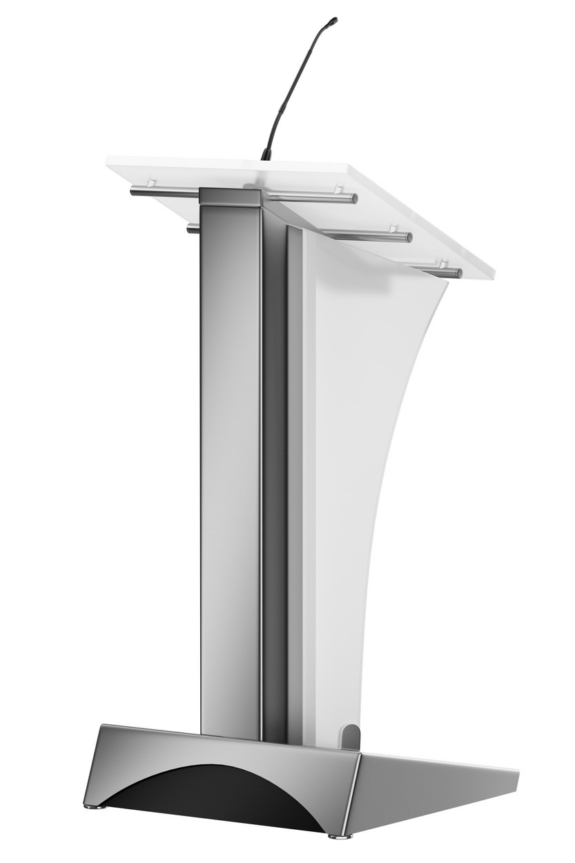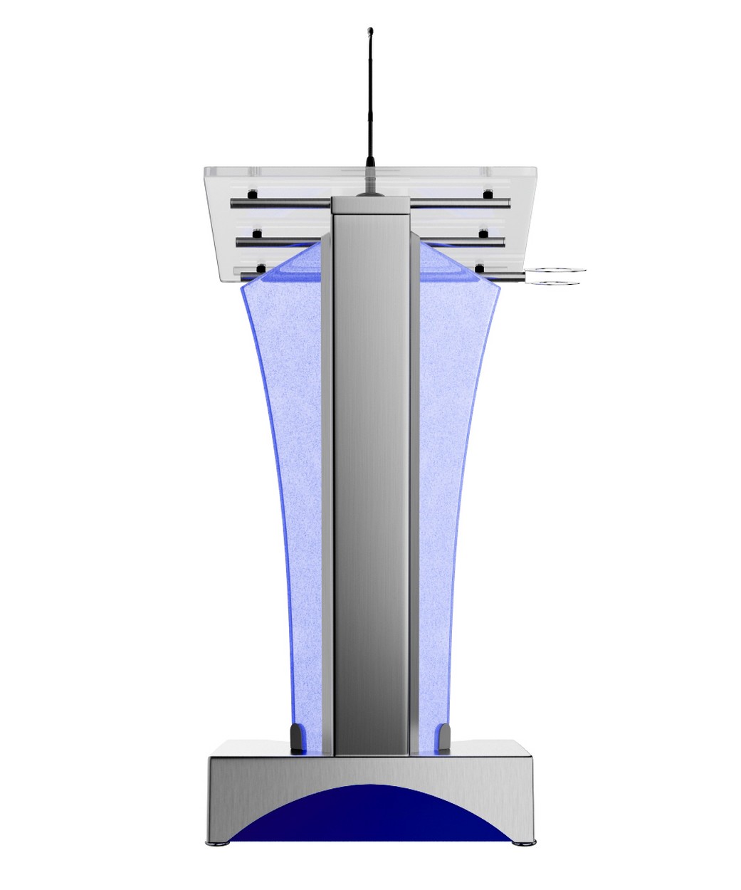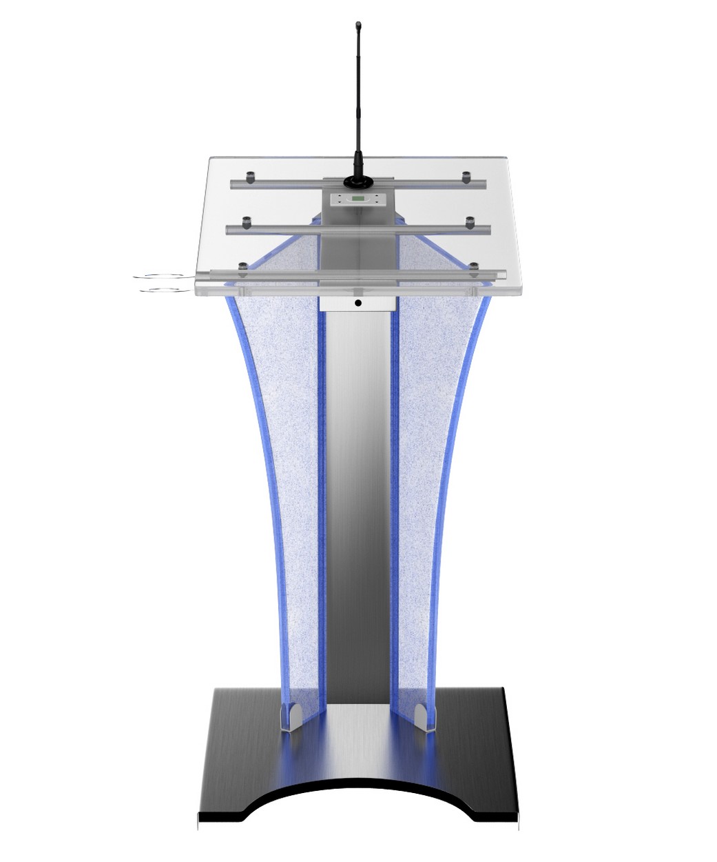 Rednerpult aus gebürstetem Edelstahl mit LED RGB Frontplatte. Per Fernbedienung sind viele Farbmischungen möglich.