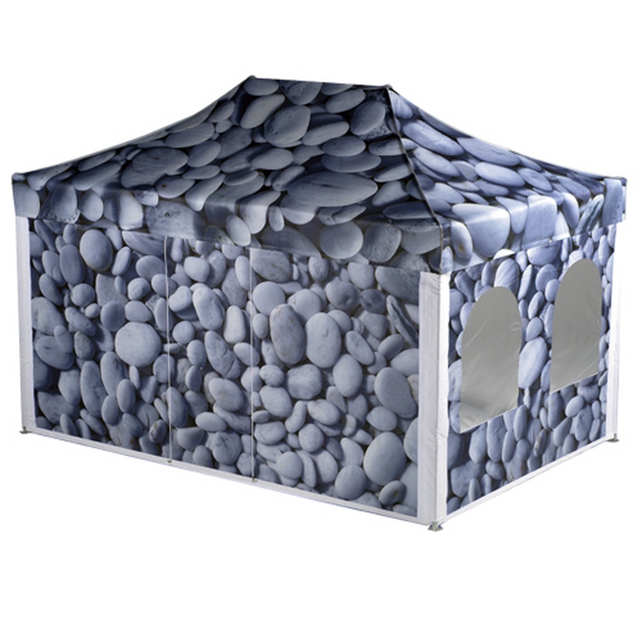 das gesamte Zelt, nicht nur einzelne Flächen, wird mit den gewünschten Motiven bedruckt, fast unbegrenzte Möglichkeiten in der Bedruckung von Bildern, Farben, Fotos, usw., kostengünstige Einzelfertigung für Großdrucke.