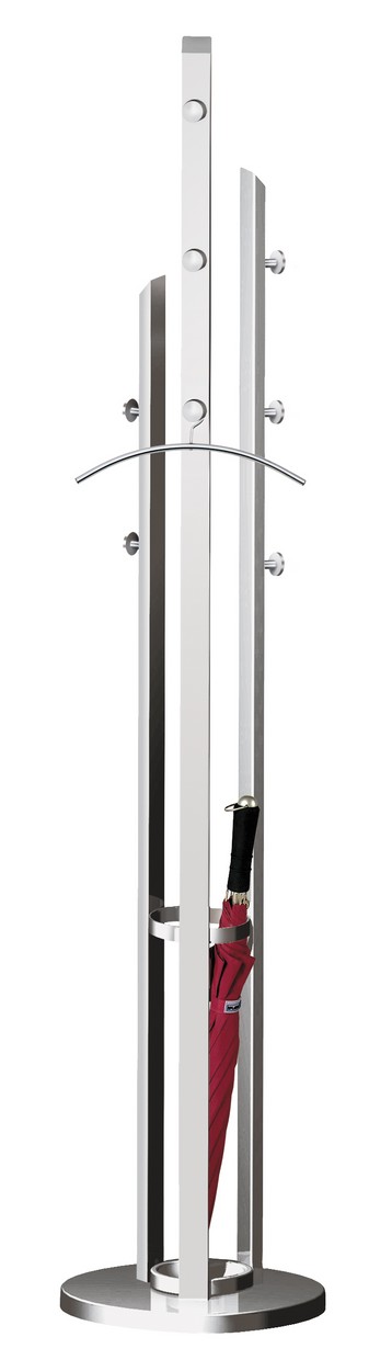 Garderobenständer in moderner Rohrkonstruktion aus Stahl, pulverbeschichtet in alusilber. Die 3 Säulen, in unterschiedlicher Länge, sind mit insgesamt 8 Haken und zentralem Schirmhalter mit Abtropfvorrichtung ausgestattet. Standfest durch schweren Fuß.