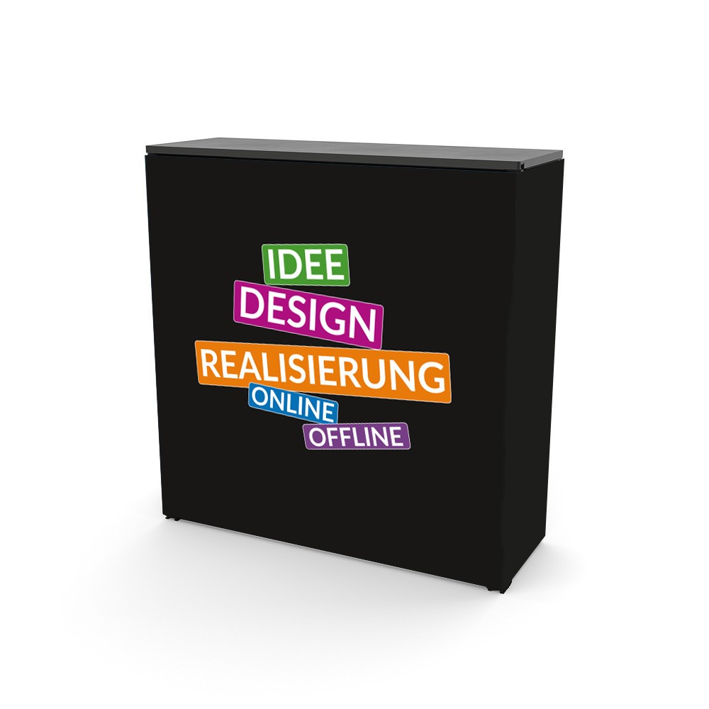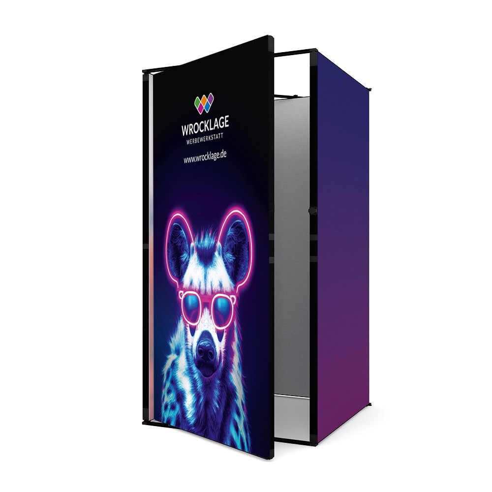 5x System 100x 250 cm, Kabine, Systemfüße, Softbag, Kunststoffverbinder, 7 Textil-Digitialdruck auf Blockout Material mit Silikonkeder konfektioniert, Theke mit schwarzer Thekenplatte und Textildigitaldruck