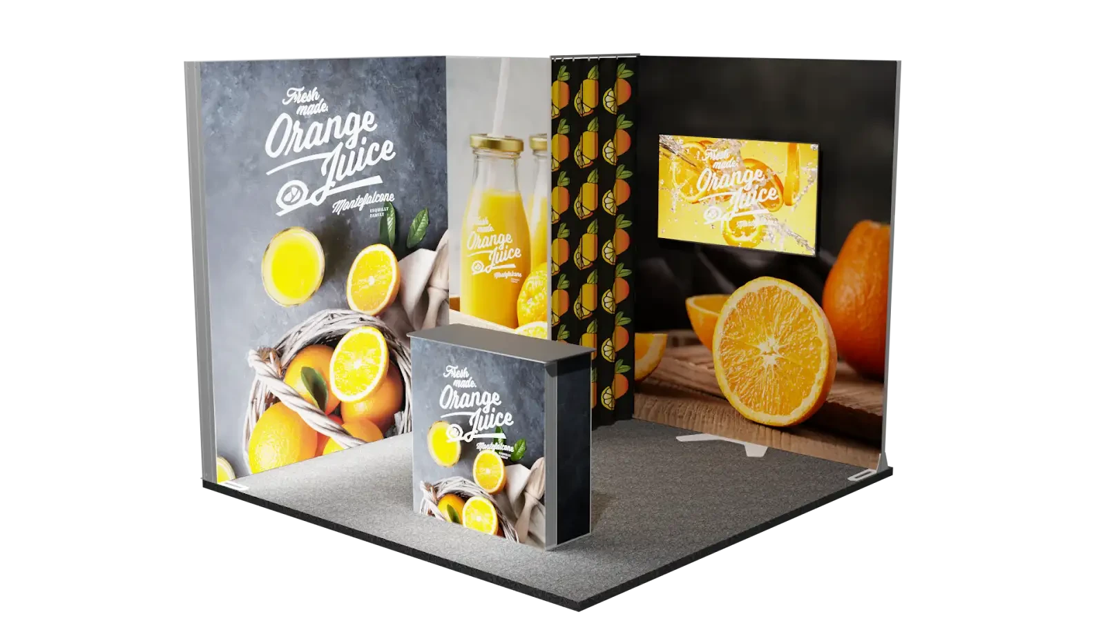 Expolinc LightFrame Eck-Messestand mit Kabine und Monitor Stand 3x3 m