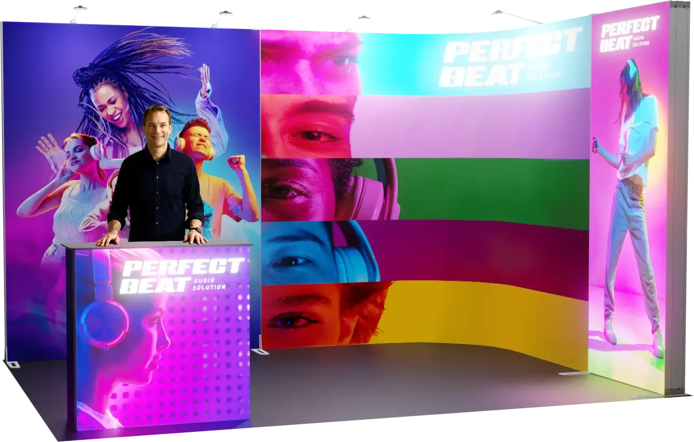 Eck-Messestand mit Bogen und hinterleuchteten Elementen