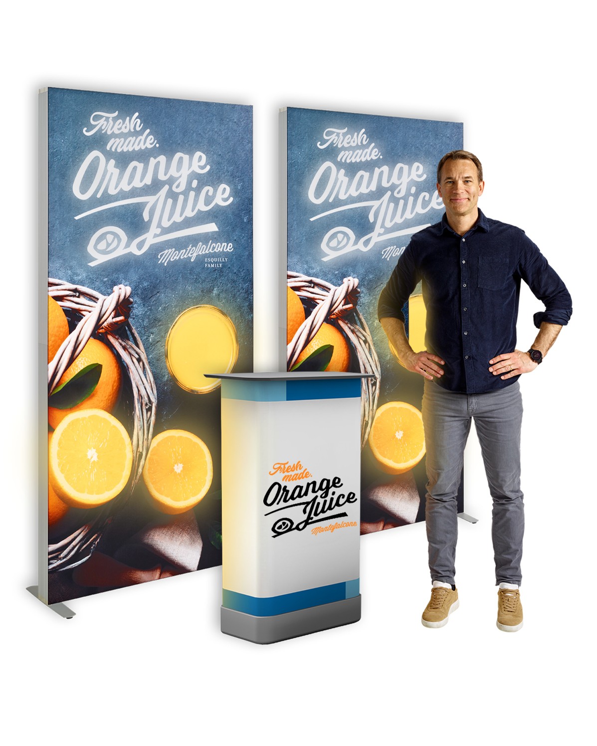 inkl. 2 Textildrucke für die Vorder- und Rückseite, gedruckt auf Backlit B1, Textilgewebe durchlicht, mit Keder umlaufend konfektioniert