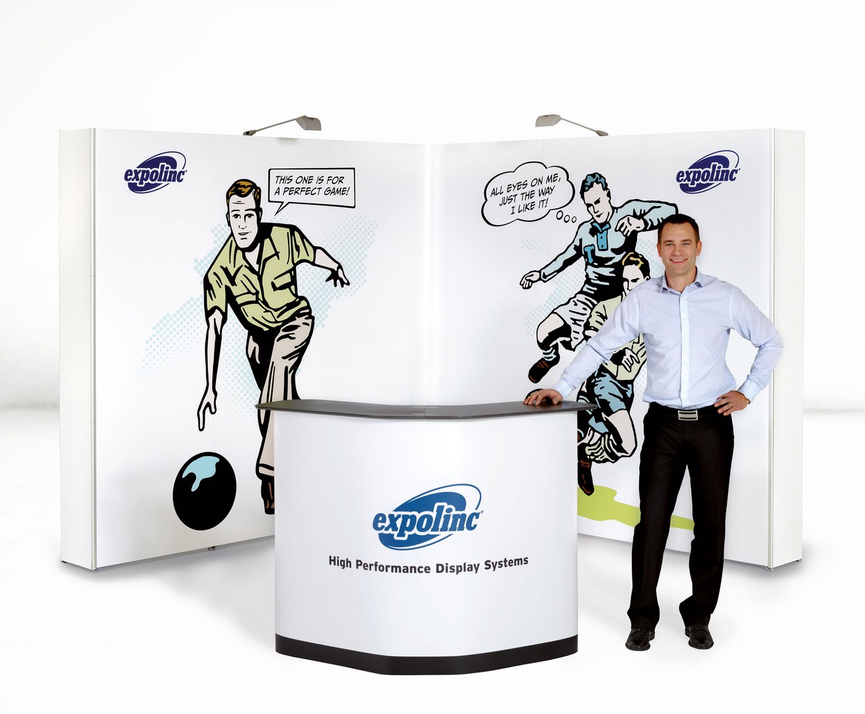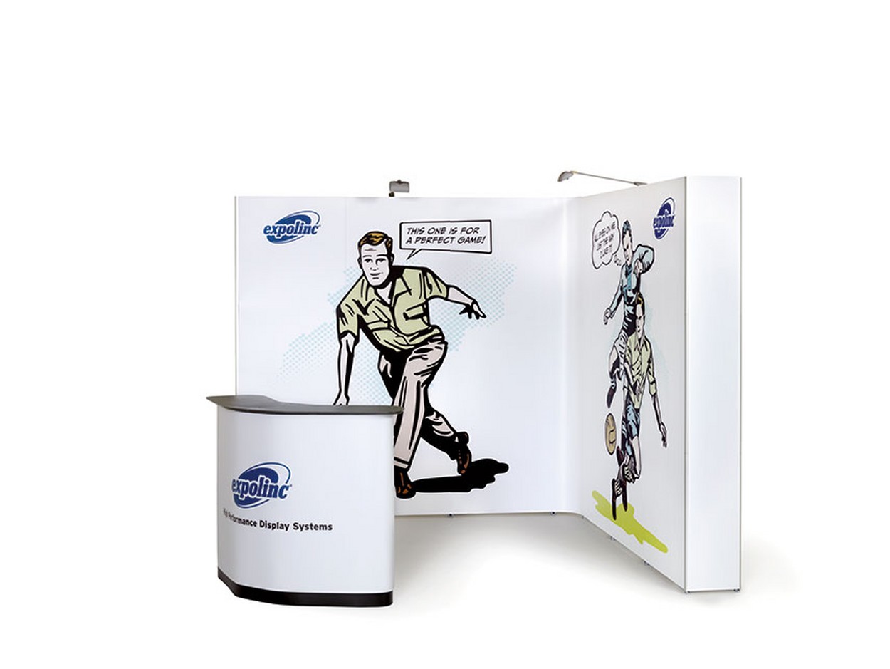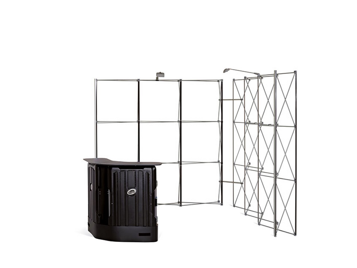 Dieser mobile Messestand ist für Flächen bis zu 10 qm geeignet. Er besteht aus 2 Faltwänden mit einer Verbindungsbahn und einer Theke.