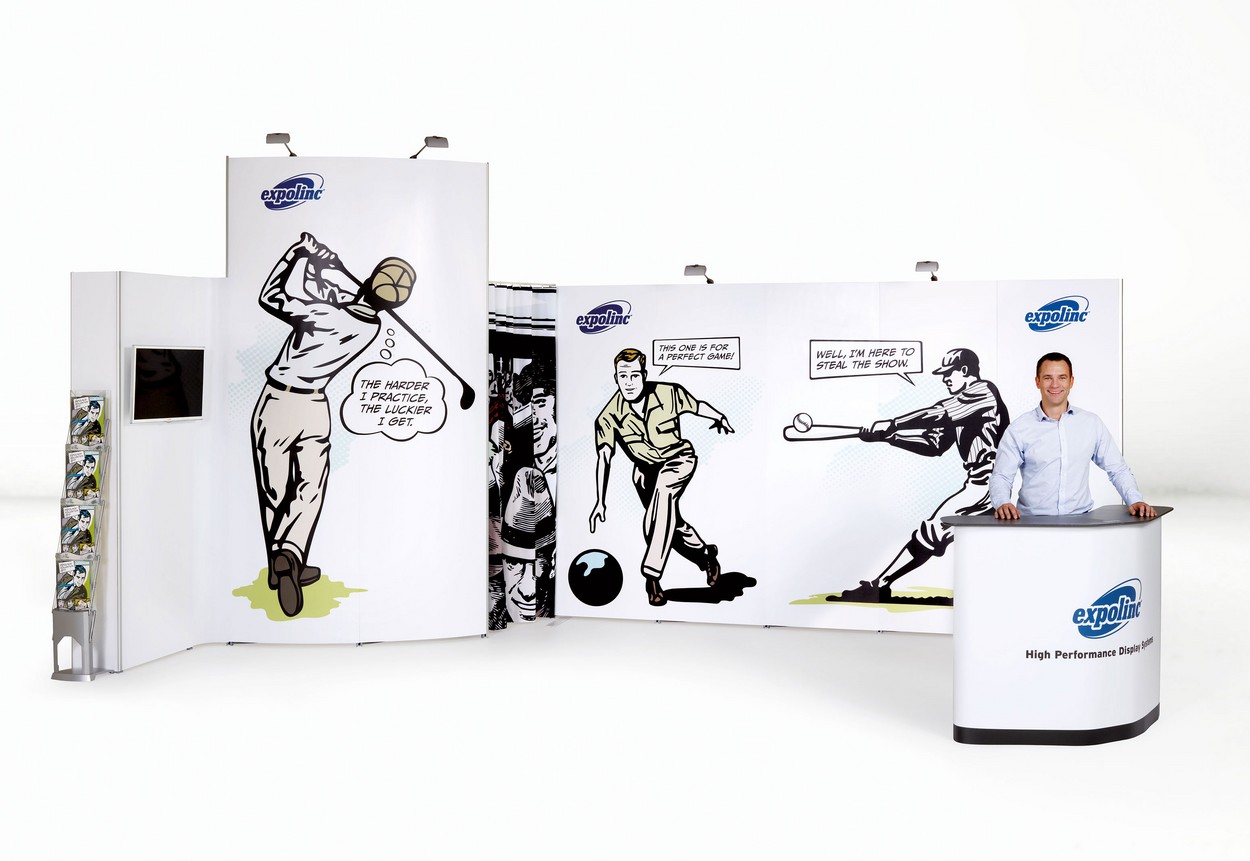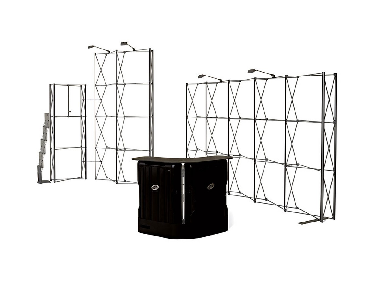 Dieser mobile Eckstand ist mit einem Abstellraum, verschiedenen Faltdisplays, einem Monitorhalter, Prospektständer und einer Theke ausgestattet. Ideal für Messestände bis ca. 20 qm.