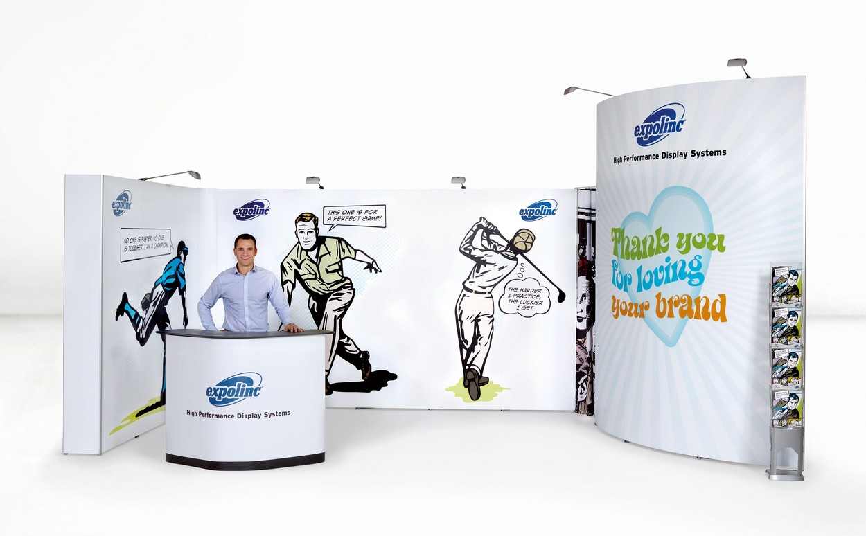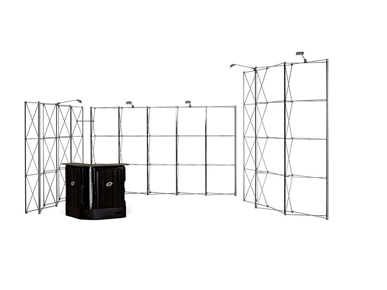 Dieser mobile Messestand ist auch aus der Ferne schon ein richtiger Hingucker: Ein überragendes Faltdisplay bietet eine große Werbefläche und teilt diesen Reihenstand in Präsentationsfläche und Abstellfläche / Stauraum auf.