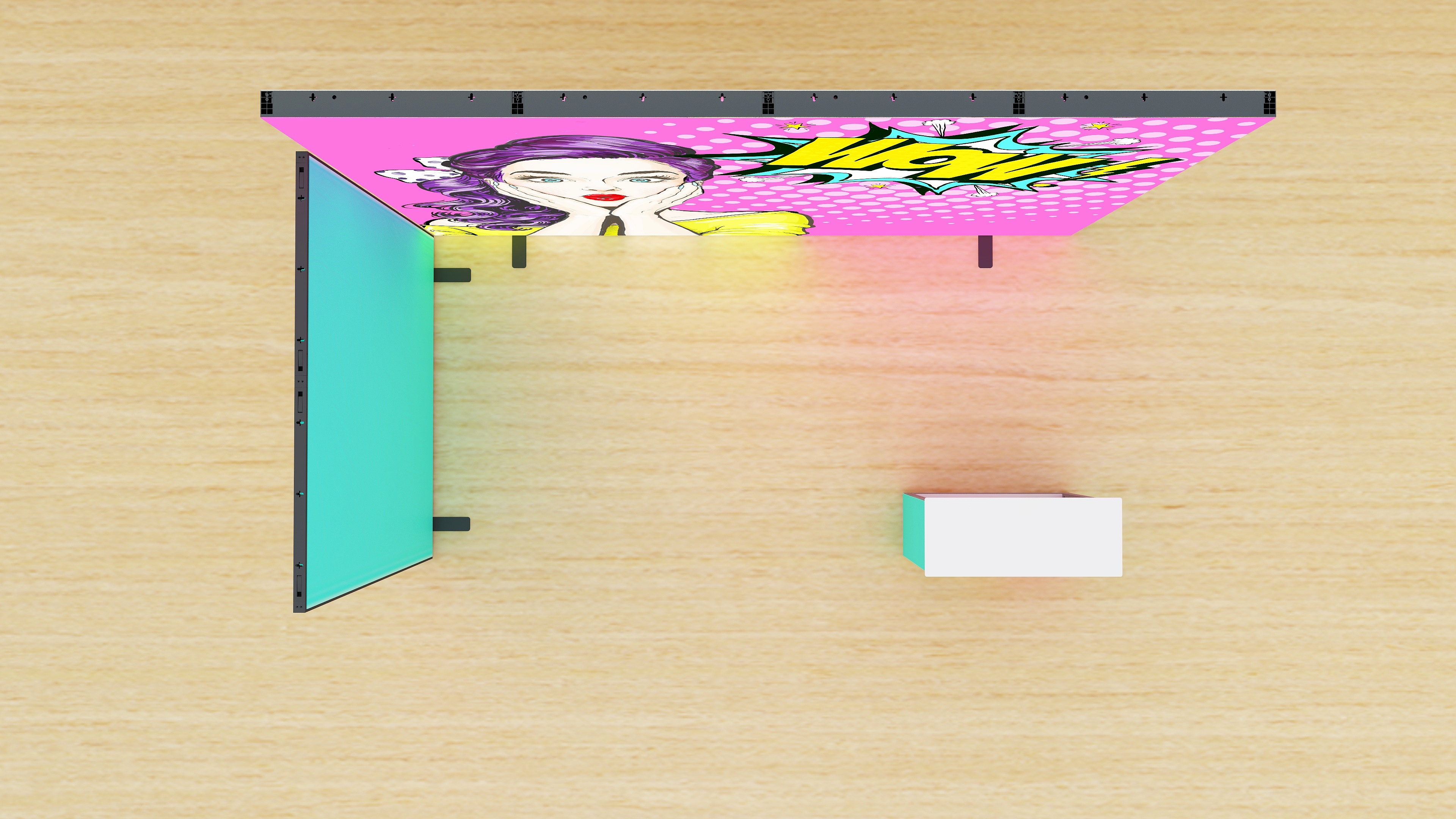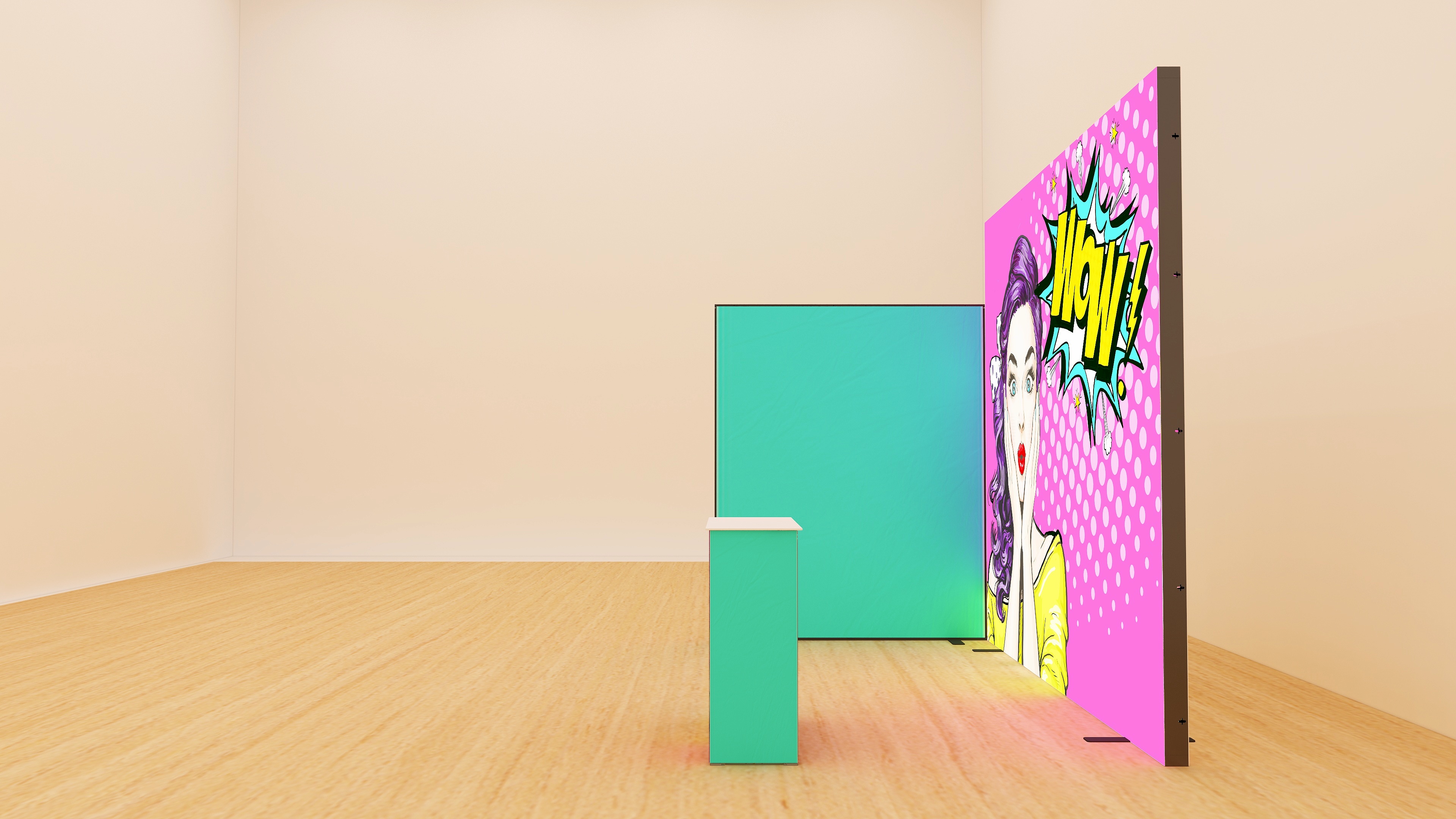 Die Systemhöhe der 2m Wand liegt bei 2,50 m. Das LED Beleuchtetes Wandelement ist 4 m breit und 3 m hoch. Diese Kombination ist ideal für klein Messen, da die LED Wand ein absoluter eyecatcher ist. Die kleine Theke mit einer Breite von 1 m rundet Ihren Messeauftritt ab. Alle Wände werden mit einem Textildruck auf Backlit oder Blockoutstoff mit B1 Zertifizierung ausgestattet.