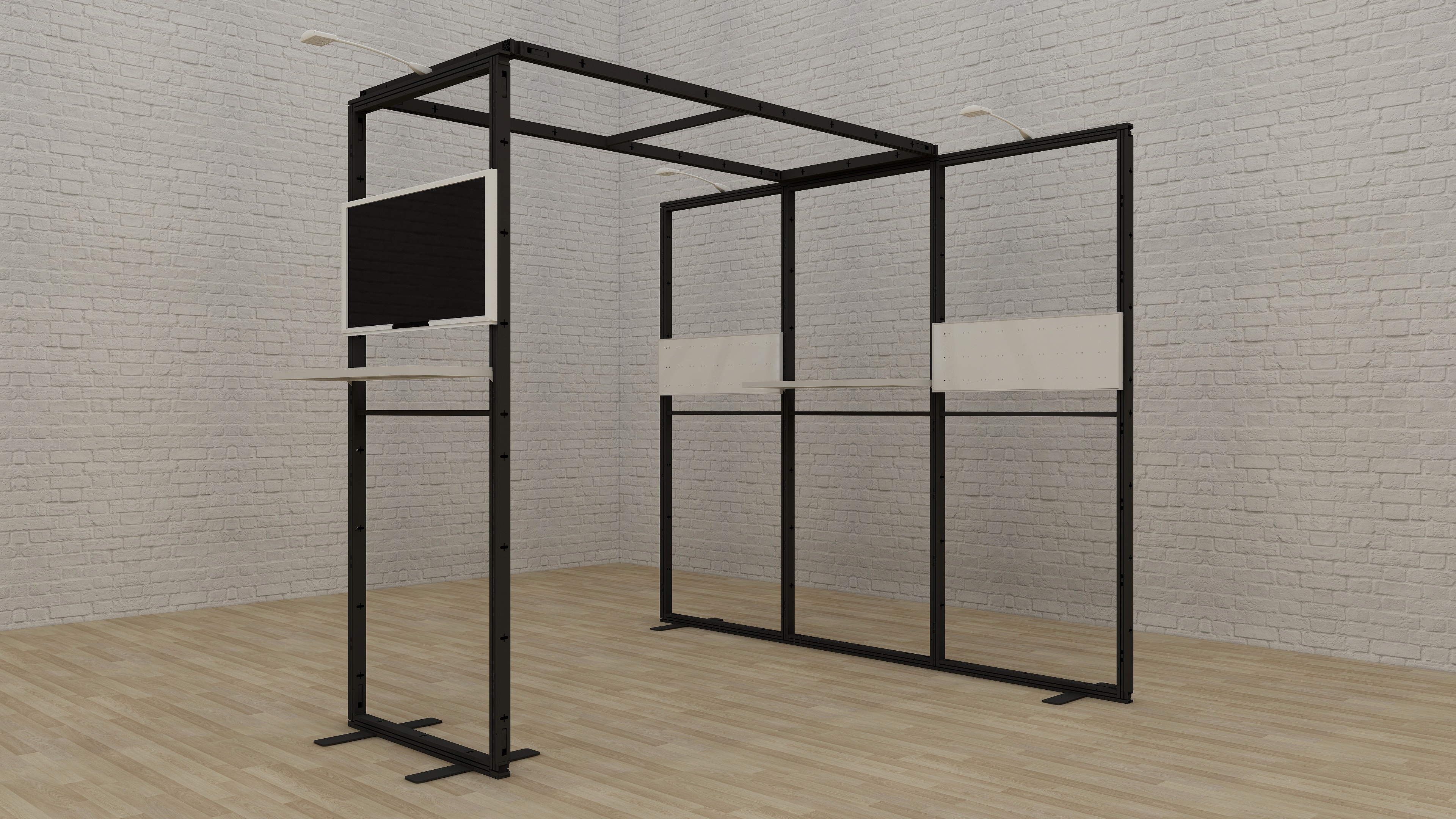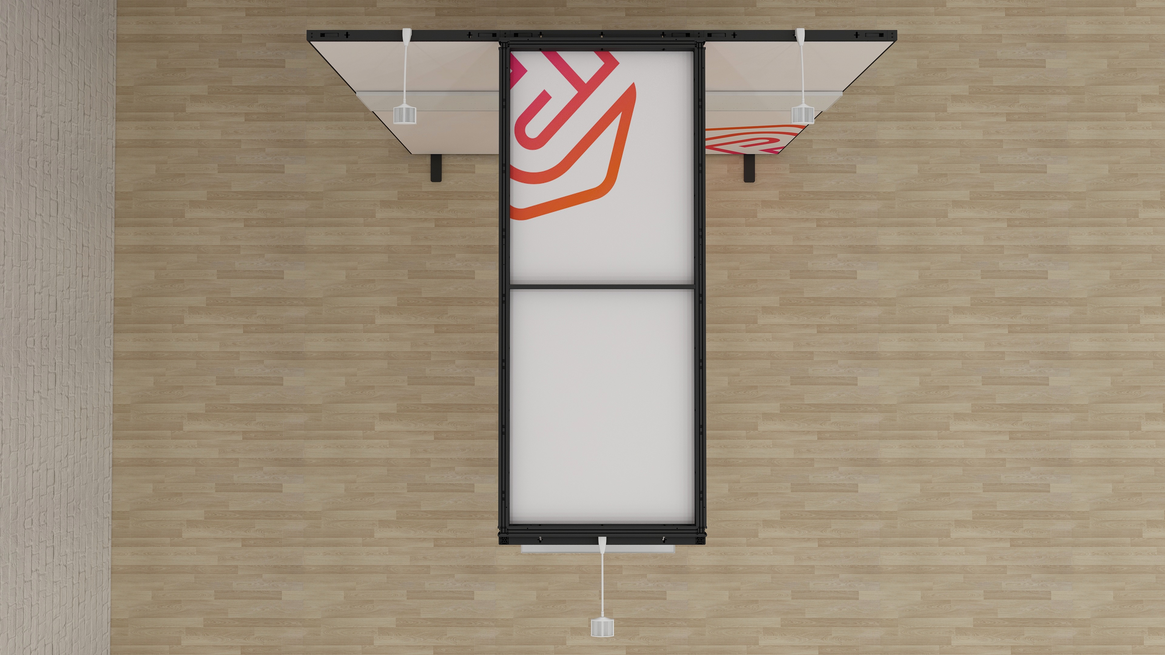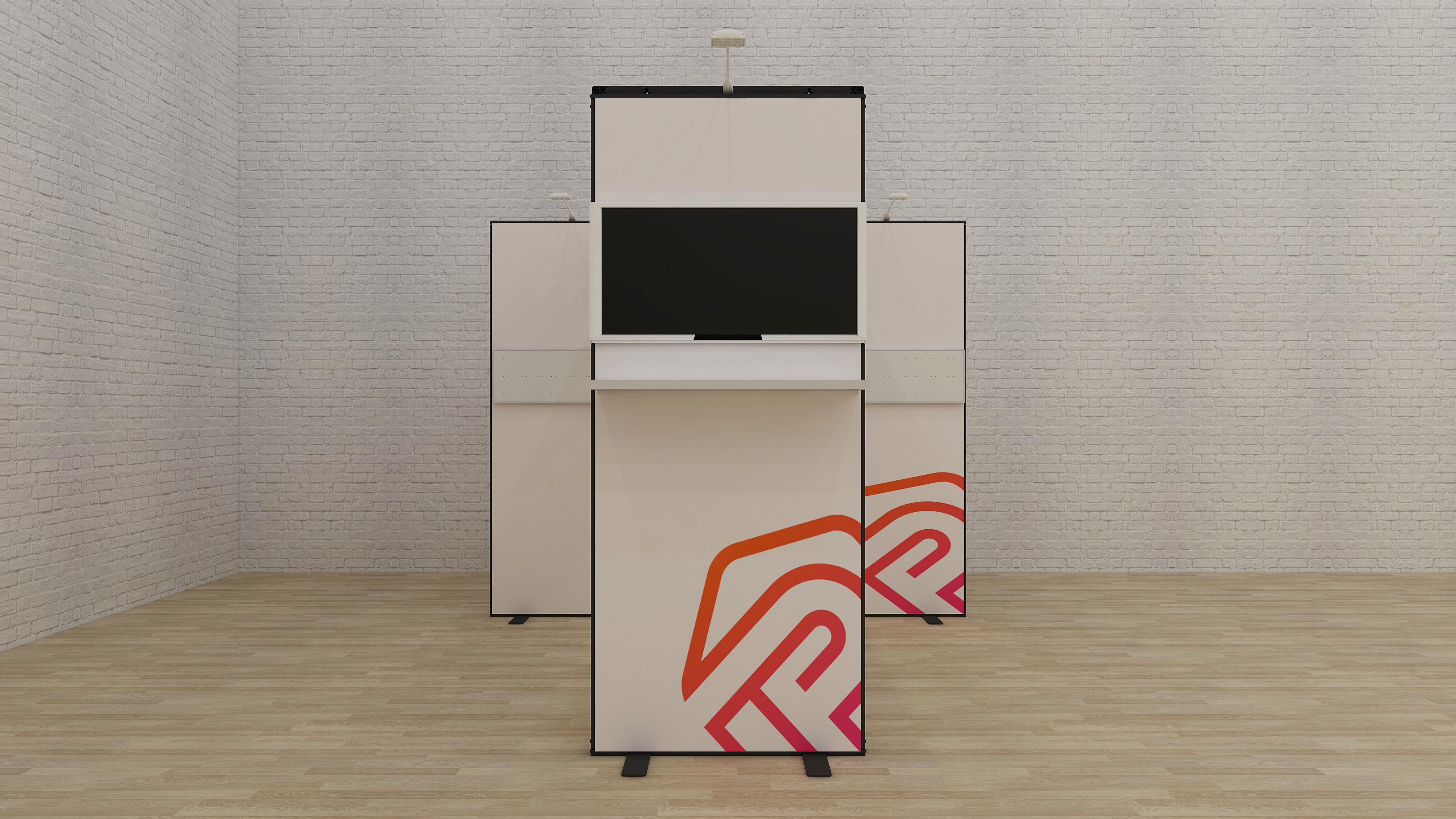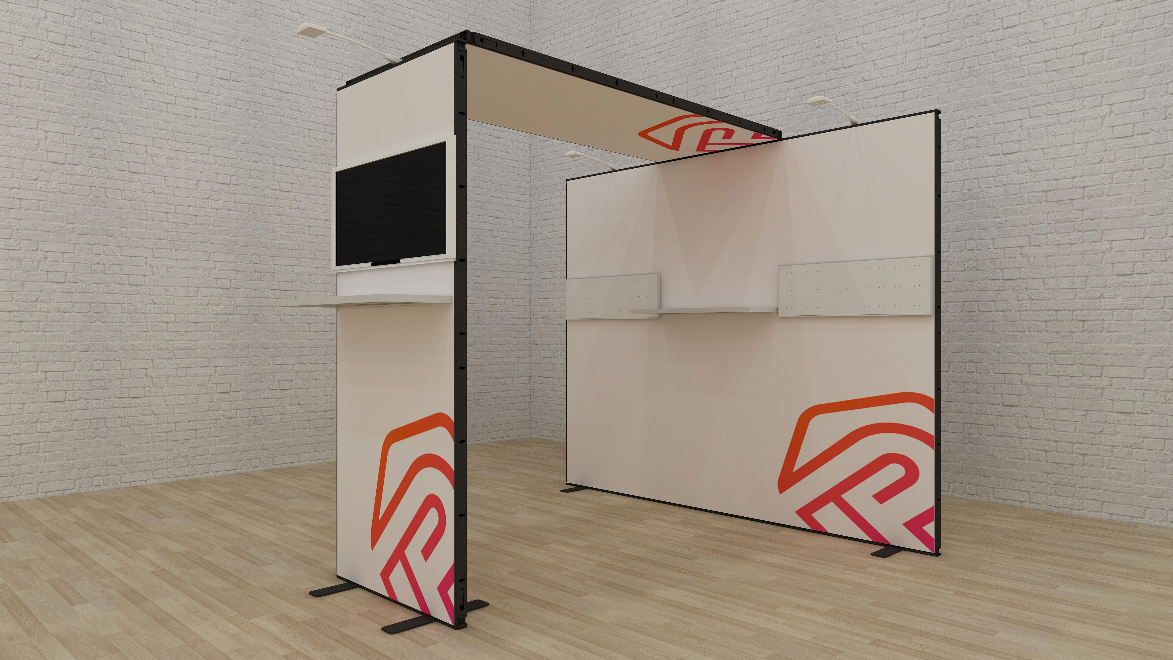 Die Standard Systemhöhe liegt bei 2,50 m. Die 3 m lange Rückwand ist mit Ablageboden und Produktdisplays ausgestattet. Die 2,50 m lange Brücke, die in der Mitte des Messestand befestigt ist, bietet mit dem angebrachten Monitorhalter ein zusätzlicher Blickfang für Ihre Kunden.