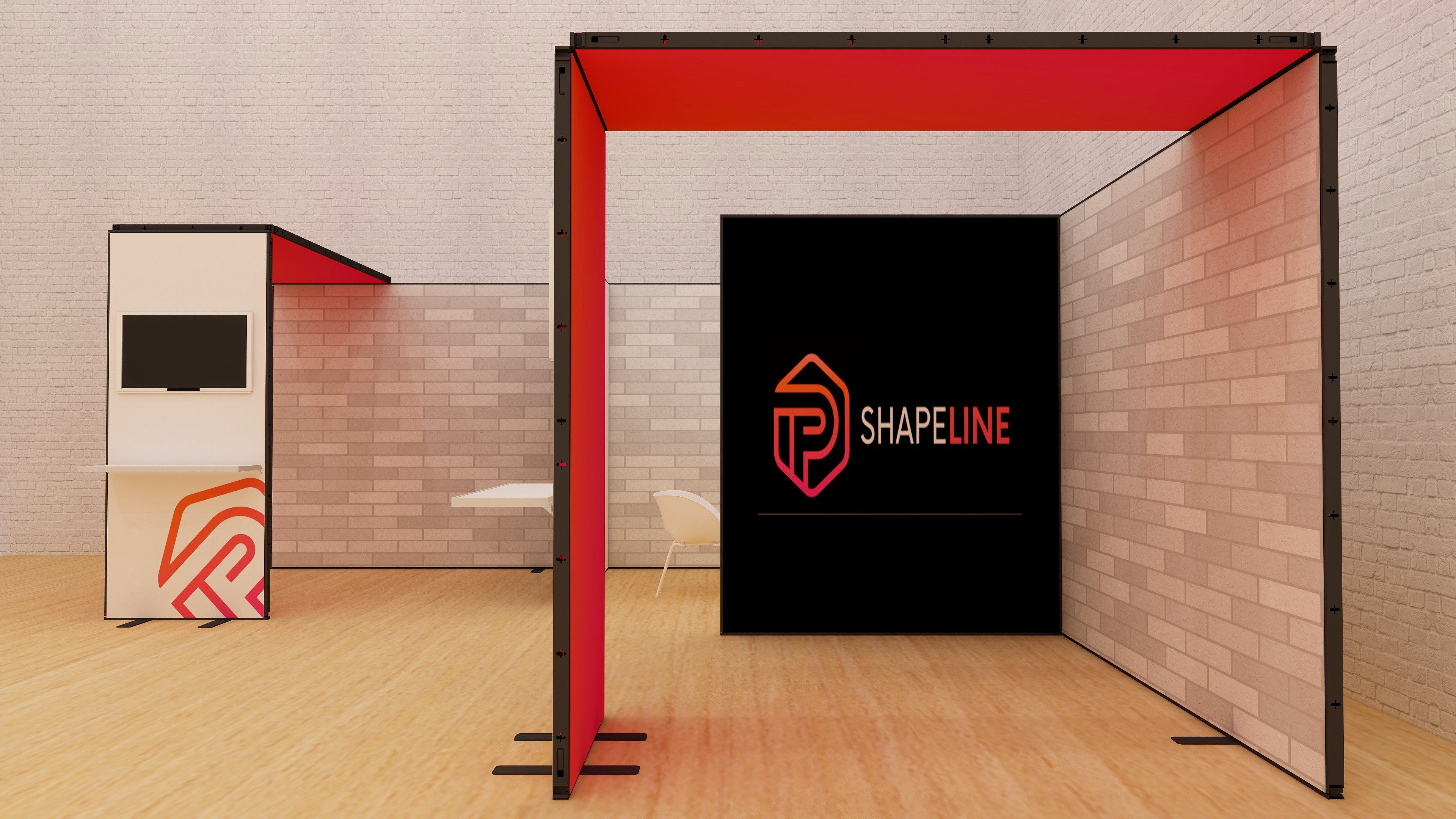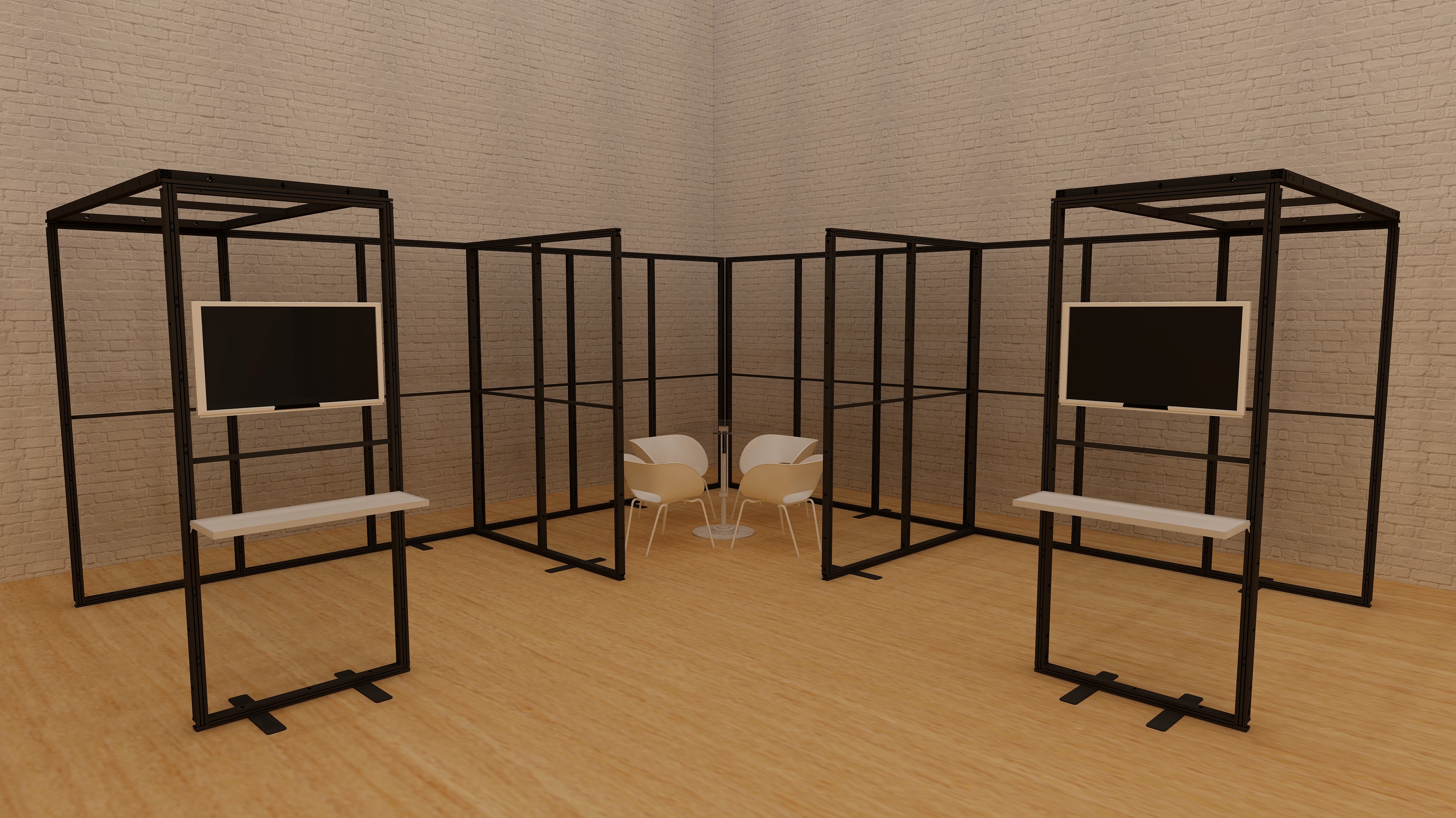 Der Messestand ist mit einem offenen Besprechungsraum ausgestattet. Hierzu werden 2x 2 m Elemente als Trennwand mittels Eckverbinder an die Messerückwand befestigt. Die 2,50 m langen Brücken in Kombination mit dem Monitorhalter und dem Regalboden sind ein zusätzlicher Blickfang für Ihre Kunden. Alle Wände werden mit einem Textildruck auf Backlit mit B1 Zertifizierung ausgestattet.