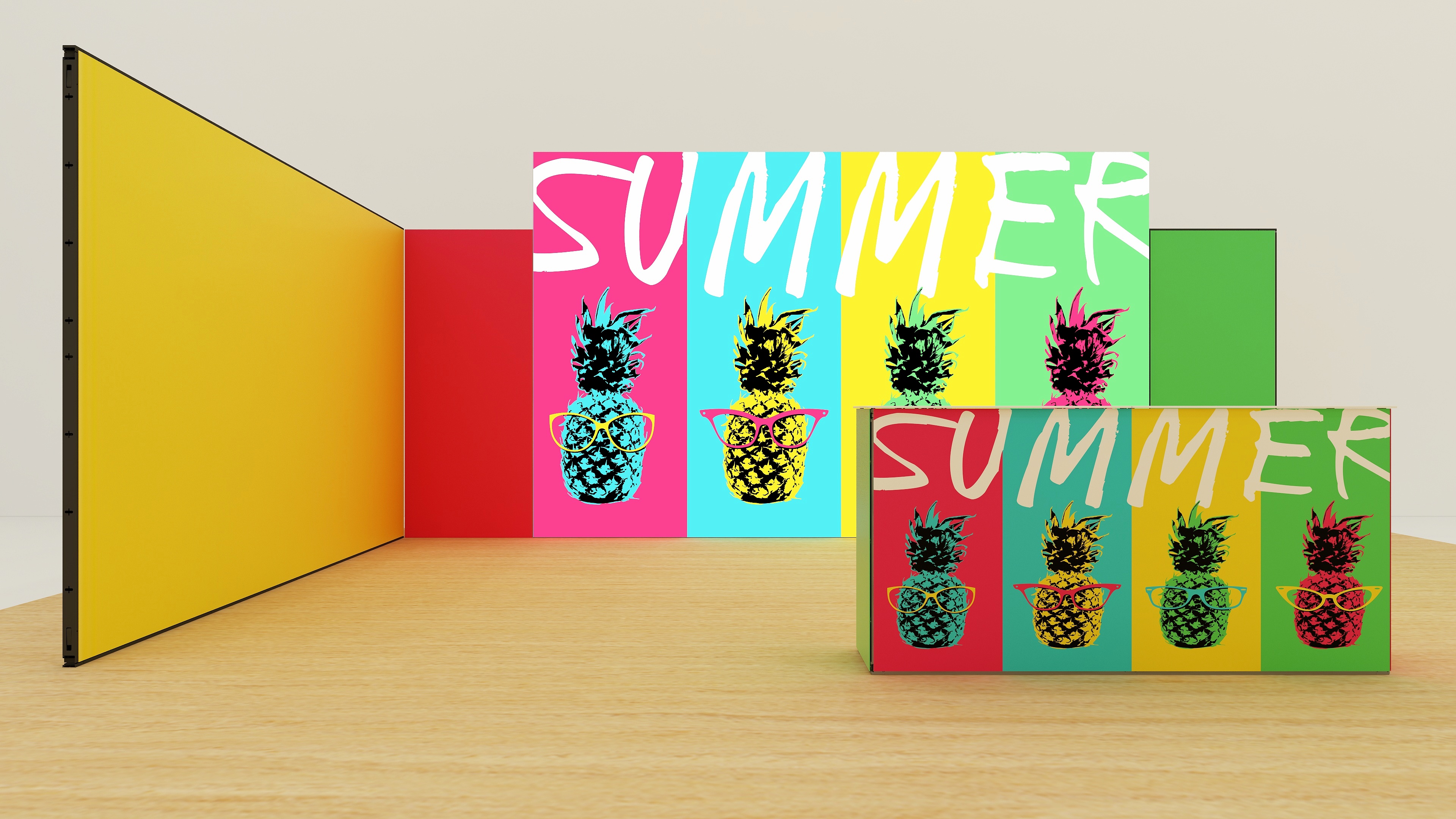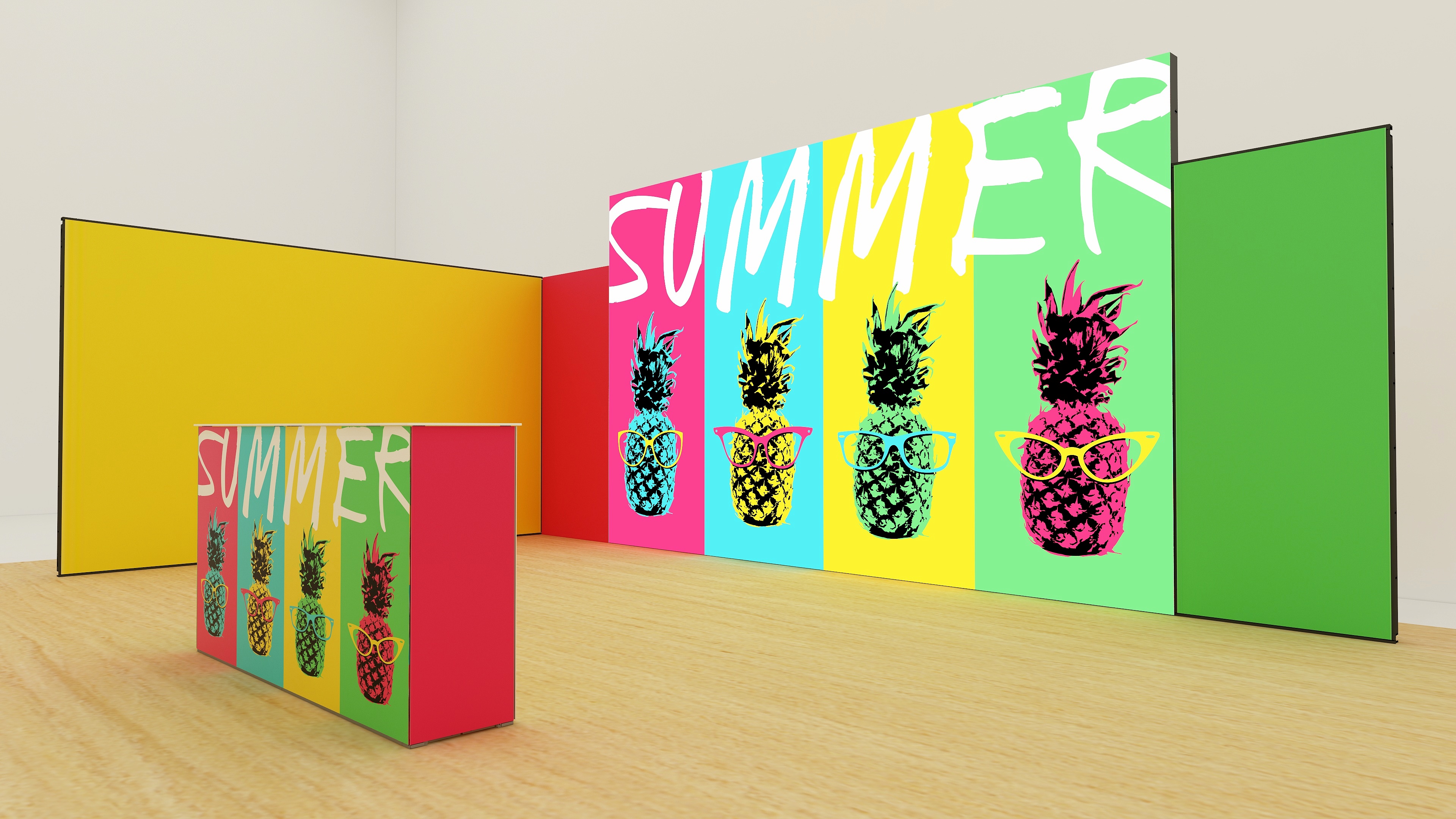 Alle Wände werden mit einem Textildruck auf Backlit oder Blockoutstoff mit B1 Zertifizierung ausgestattet.