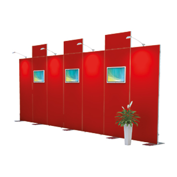 Freistehende Messewand des Markenherstellers Octanorm mit vielseitigen Einsatzmöglichkeiten.