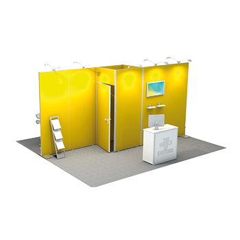 Messestandsystem vom Markenhersteller Octanorm, Standaufbau mit Kabine für eine Standgröße 5 x 1 m .