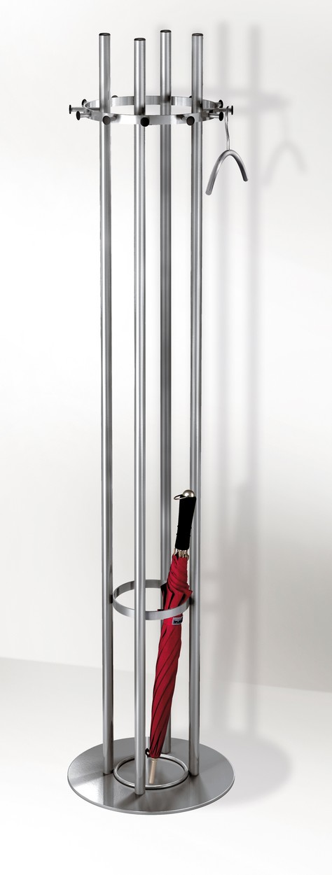 fläche. Vier stabile Edelstahlsäulen die oben durch einen eleganten Kranz mit 12 Haken verbunden sind. Der Schirmhalterring mit Tropfmulde verschaffen den Säulen unten ihre Stabilität. Der große Fuß aus Edelstahl bietet eine hohe Standfestigkeit. Optional mit Kleiderbügeln aus Edelstahl.