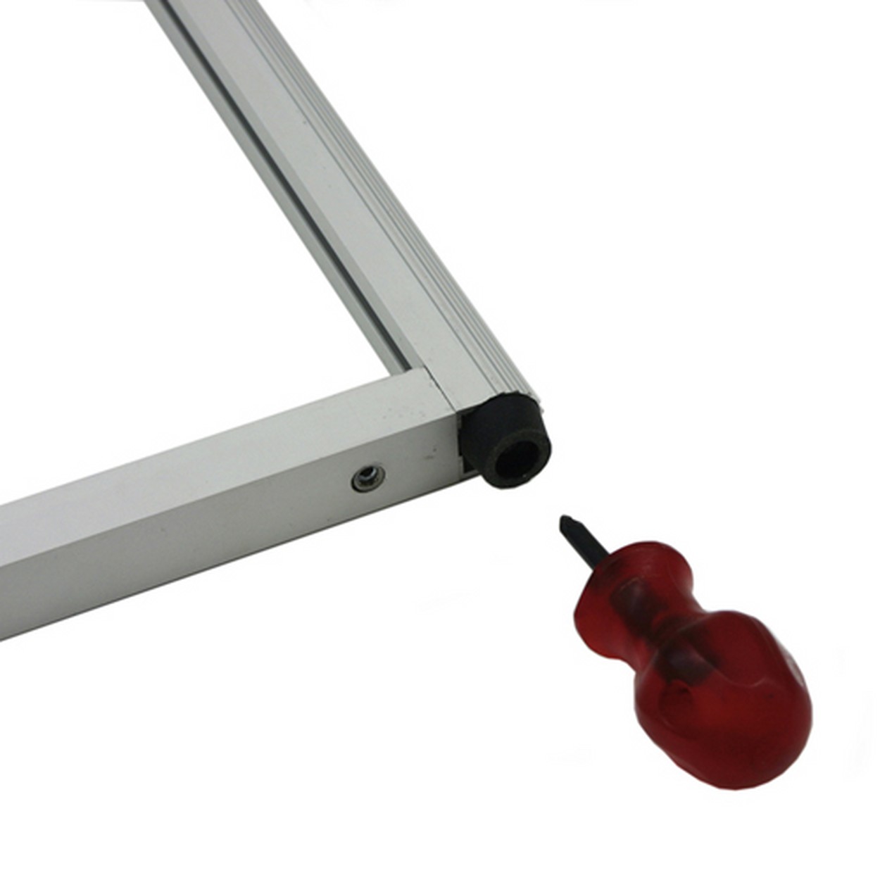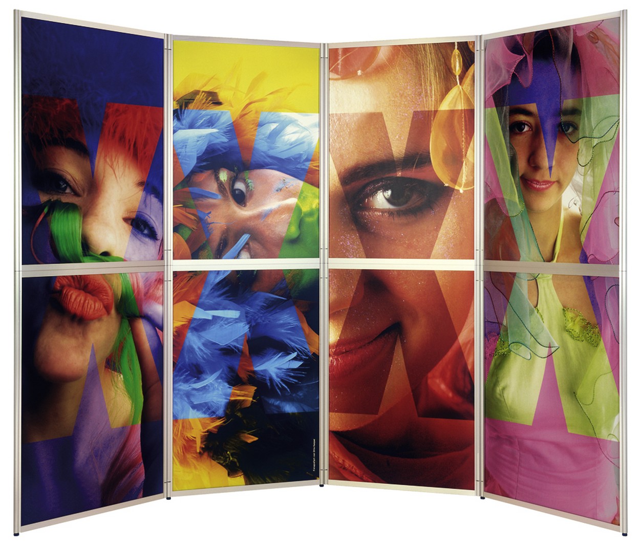 Zwei fix und fertig dekorierte Rahmenelemente, die sich ohne Werkzeug blitzschnell aufeinander stecken lassen und aufgefaltet ein rundum repräsentatives Display bilden. Eine zusätzliche Blende kann leicht ergänzt werden. Die Wandteile lassen sich beliebig in jede Richtung winkeln.