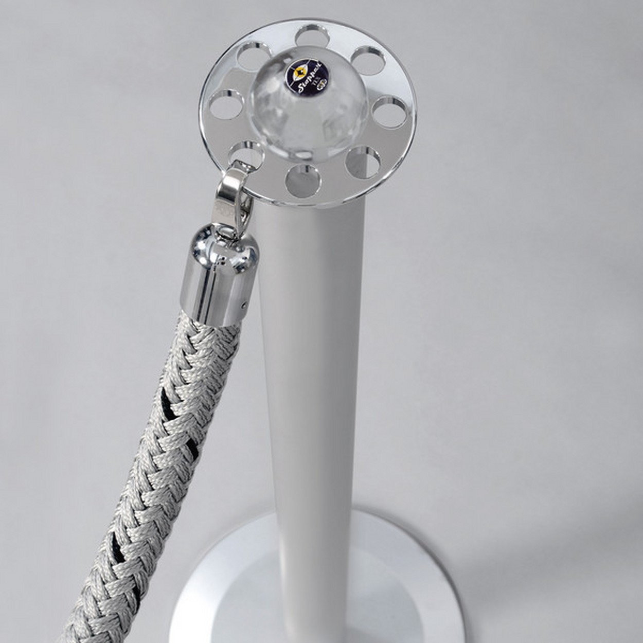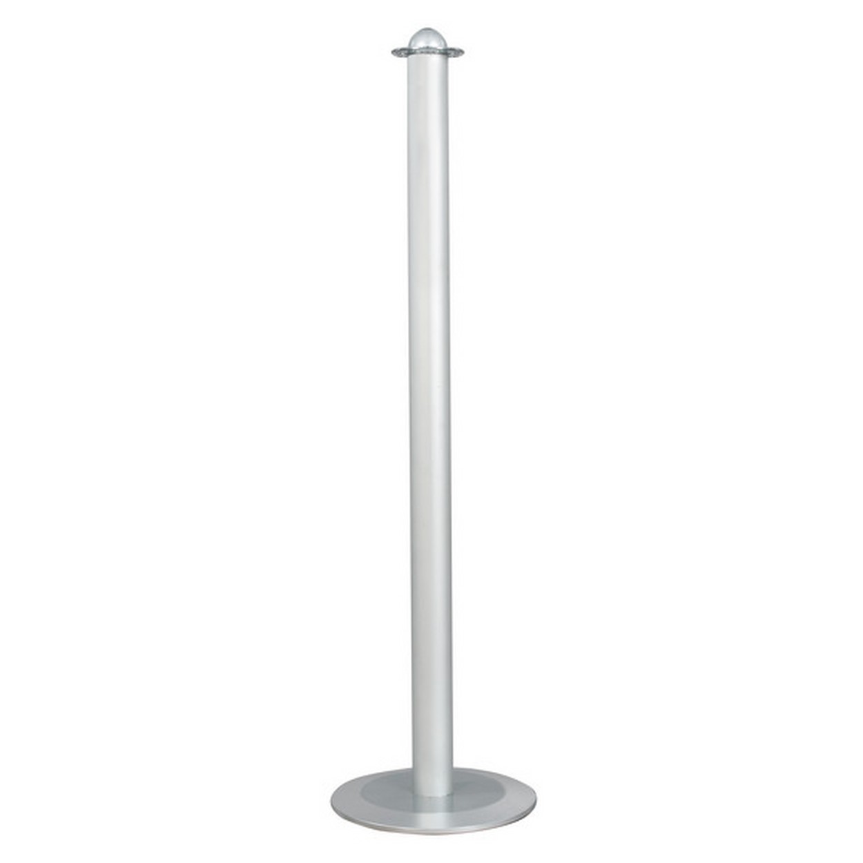 Basis ø 240 mm mit Grundplatte in Eisen, ABS-Abdeckung lichtgrau, Dekoreinsatz silber eloxiertes Aluminium.