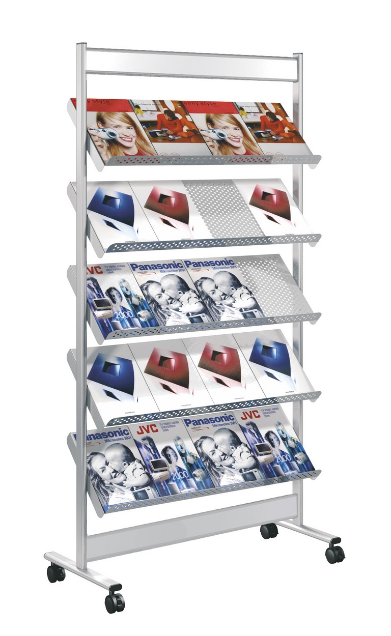Praktisches Prospektregal. Stabile Stahlkonstruktion aus Flachovalrohr, pulverbeschichtet. Mit 5 Böden aus hochwertigem Lochstahl und einer 40 mm hohen Anschlagkante für je 4 DIN A4 Formate. Fahrbar auf feststellbaren Zwillingslenkrollen. Serienmäßig mit oberer Abschlussblende, die auch als Beschriftungsblende genutzt werden kann.