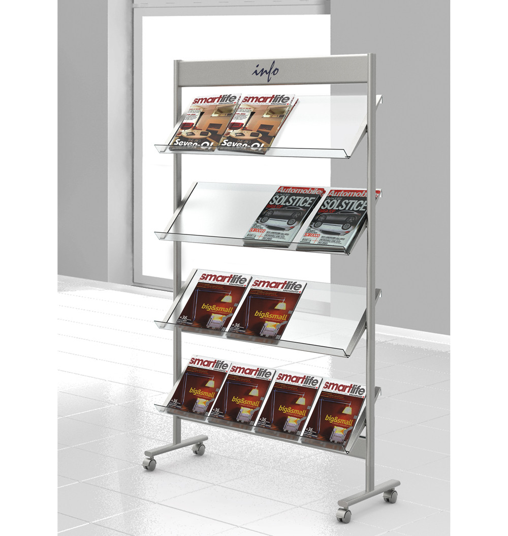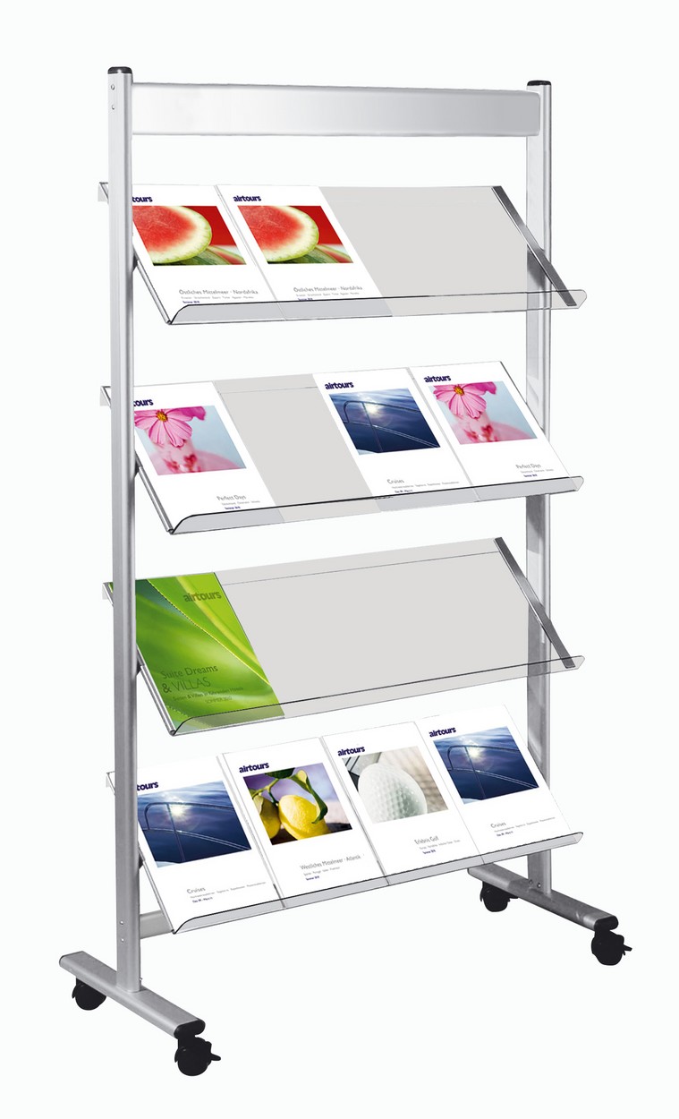 Stabile Stahlkonstruktion aus Flachovalrohr mit einer 80 mm hohen Beschriftungsblende und vier Prospektböden aus Acrylglas mit einer 40 mm hohen Anschlagkante für je 4 DIN A4 Formate. Fahrbar auf feststellbaren Zwillingslenkrollen.