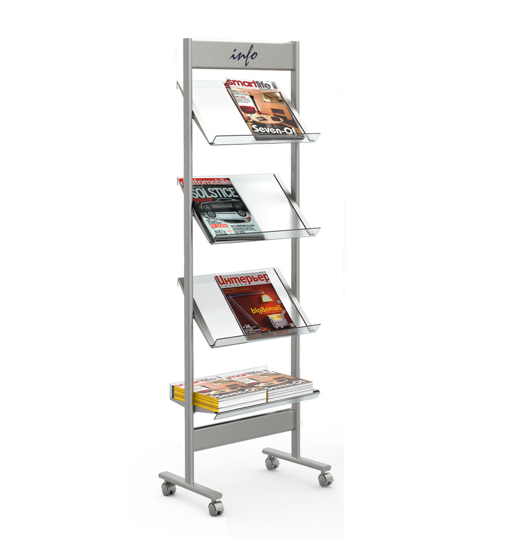 Stabile Stahlkonstruktion aus Flachovalrohr mit einer 80 mm hohen Beschriftungsblende und vier Prospektböden aus Acrylglas mit einer 40 mm hohen Anschlagkante für je 1 DIN A4 Format. Fahrbar auf feststellbaren Zwillingslenkrollen.