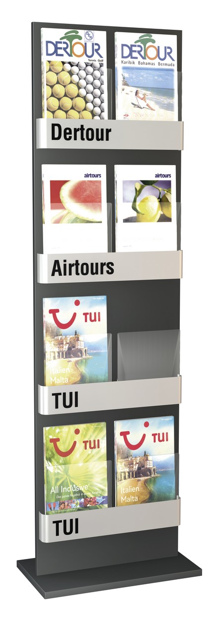 Repräsentative Prospektpräsentation mit 8 Fächern für die gängigen Prospektformate DIN A4, DIN A5 und DIN lang/DIN A6. Der Korpus ist aus Stahl gefertigt und puverbeschichtet (anthrazit). Die Prospektfächer sind silberfarbig. Die Prospekte werden durch Acrylscheiben gehalten. Der Schrifzug „Info“ ist inklusive.