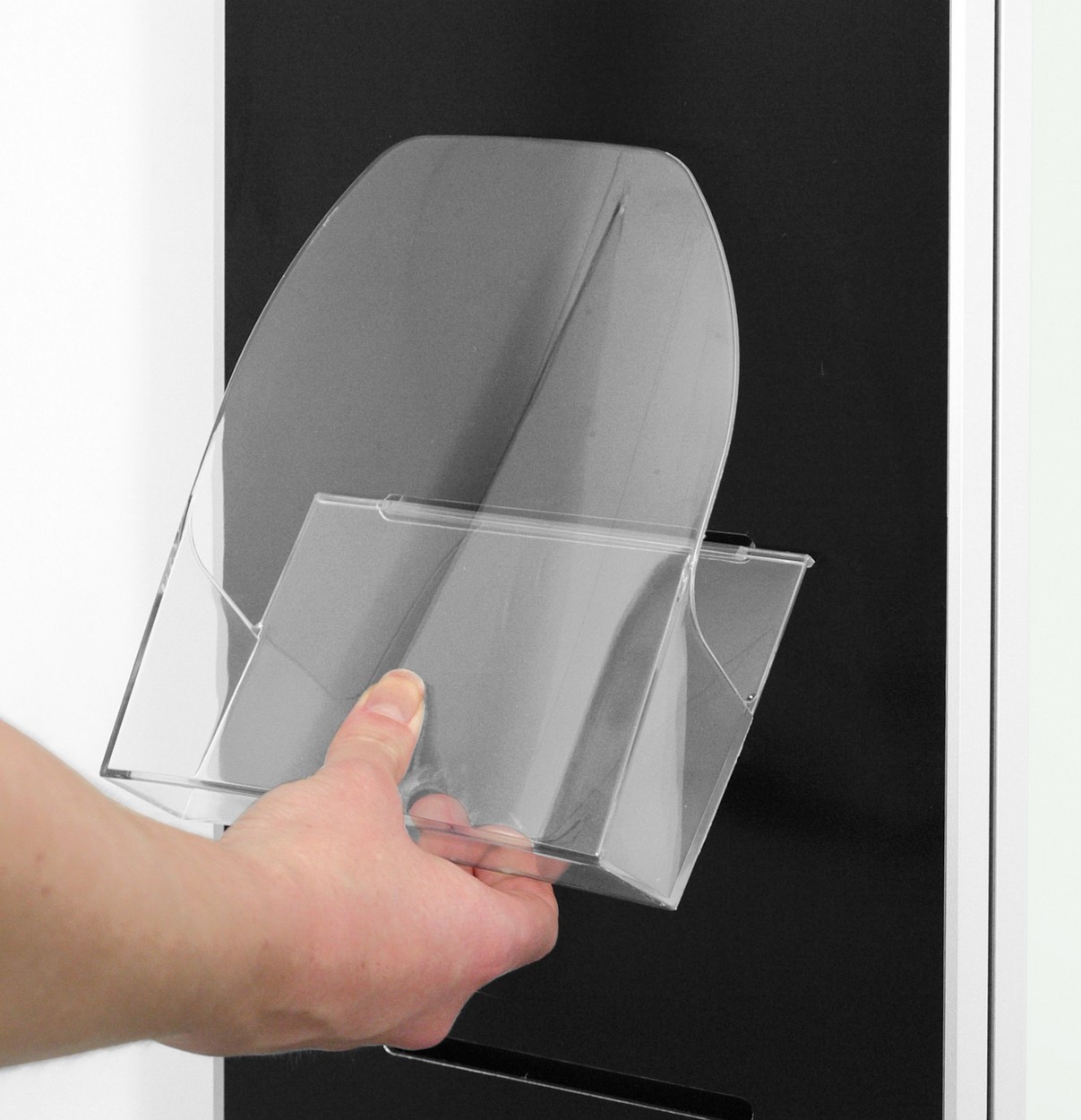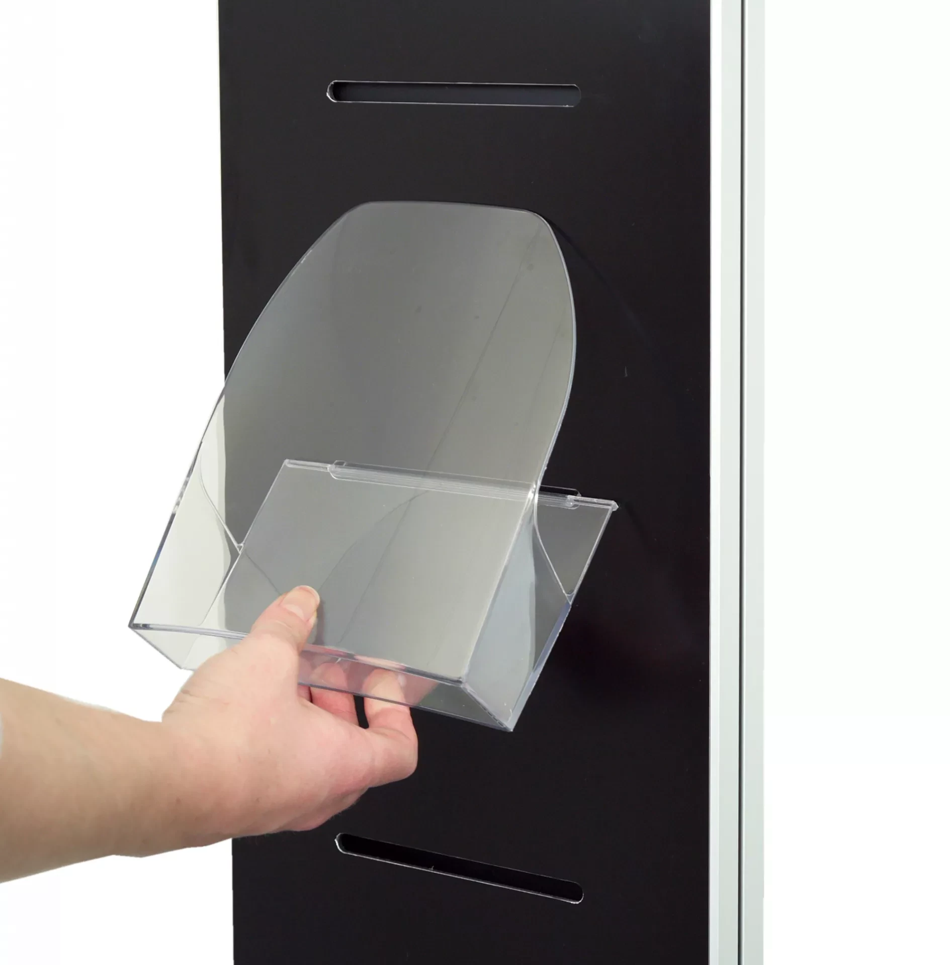 Postertasche zum Einhängen von Prospekten und Flyern in den Formaten DIN A4, DIN A5 oder DIN A6 Format, aus PS-Polystirol.