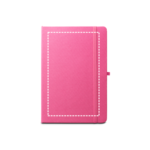 A5-Notizbuch mit festem Einband aus recyceltem Polyester (100% rPET) 300D und abgerundeten Ecken. Es enthält 160 linierte Seiten aus 100% elfenbeinfarbenem Recyclingpapier (70 g/m²), einen Trennstreifen, einen Kugelschreiberhalter (nicht im Lieferumfang enthalten) und ein Gummiband zum Verschließen. Das rPET-Symbol ist in weißer Farbe am unteren Rand des Buchrückens aufgedruckt. 143 x 211 mm