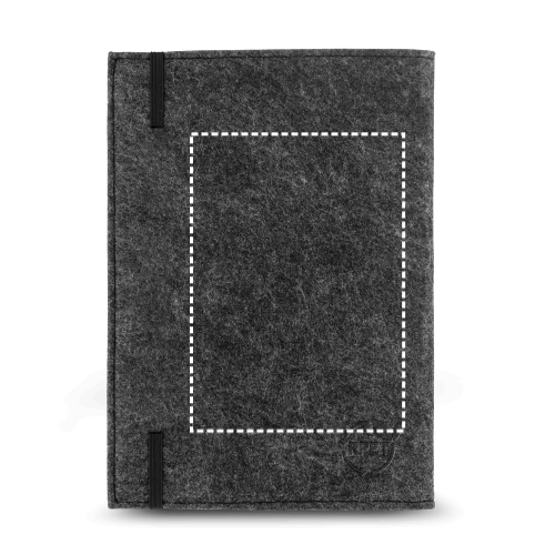 Einband aus recyceltem Filz (100% rPET) mit A5-Notizbuch im Inneren. Das herausnehmbare Notizbuch enthält den Umschlag aus 100% Recyclingpapier sowie 160 linierte elfenbeinfarbene Seiten aus ebenfalls 100% Recyclingpapier. 150 x 210 mm