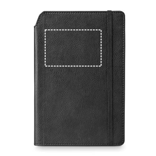 Notizbuch A5 mit Hardcover aus PU. 192 linierten Seiten (70 g/m²), aus FSC™-zertifiziertem Material und anderen kontrollierten Materialien hergestellt, einem Kugelschreiberhalter (Kugelschreiber nicht enthalten) und einem Gummiband. Geliefert in einem Non-Woven Beutel. 140 x 210 mm