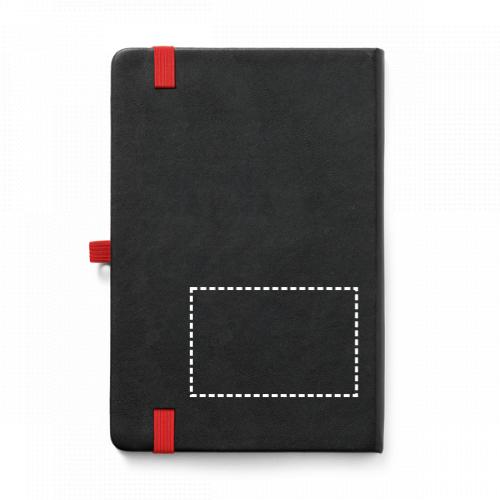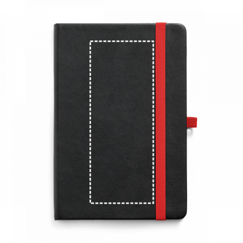 Notizbuch A5 mit Hardcover aus PU und 160 linierten Seiten, einer Innentasche, einem Gummiband und einem Kugelschreiberhalter (Kugelschreiber nicht enthalten). Das Notizbuch hat einen farbigen Untergrund, der eine Lasergravur in der Farbe des Gummibandes ermöglicht. 140 x 210 mm
