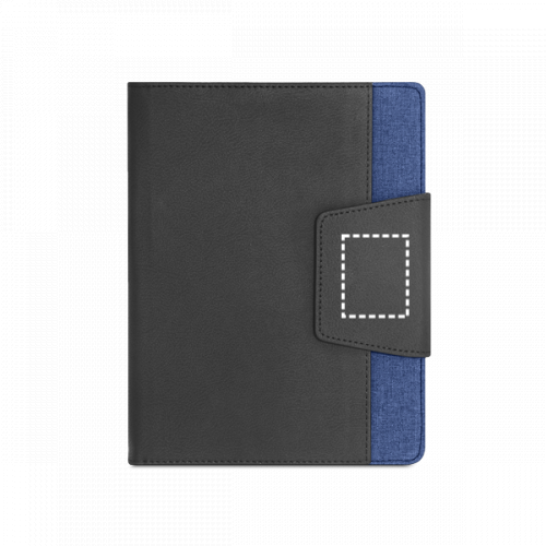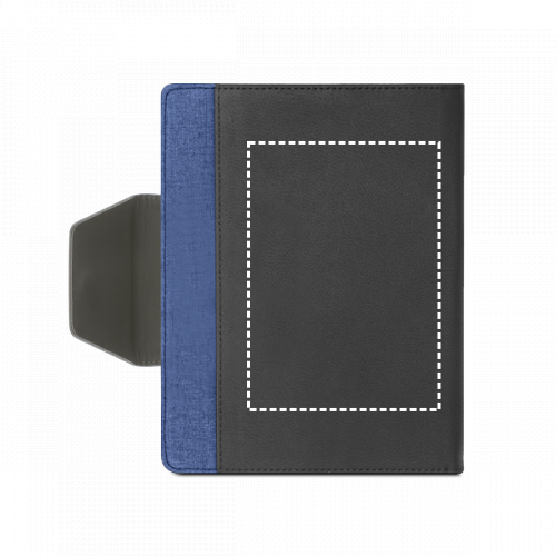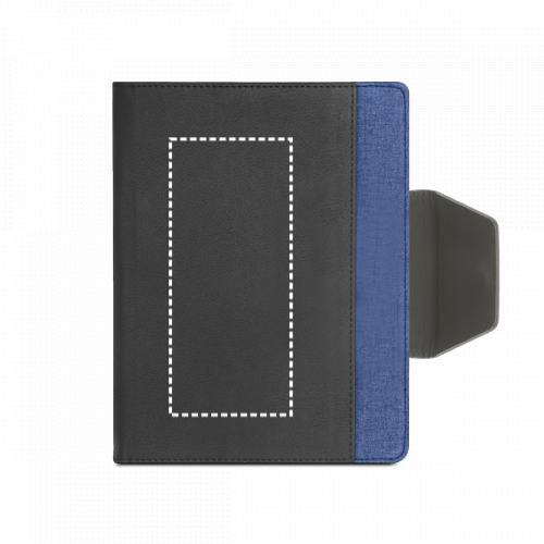 Mappe aus PU und Polyestergewebe mit abnehmbarem Notizbuch mit 160 unlinierten Seiten (70 g/m²), aus FSC™-zertifiziertem Material und anderen kontrollierten Materialien hergestellt. Die Mappe hat einen Magnetverschluss, eine Außentasche, eine Innentasche und einen Kugelschreiberhalter (Kugelschreiber nicht enthalten). Geliefert in einem Beutel aus Non Woven. 155 x 215 mm | Beutel: 205 x 250 mm