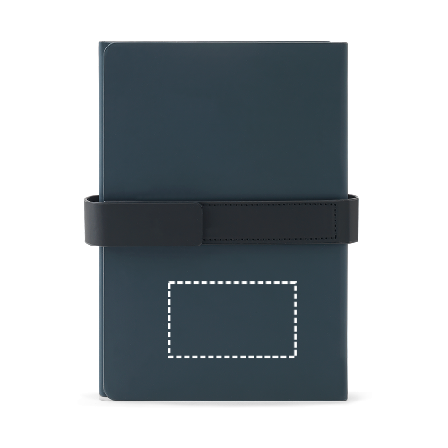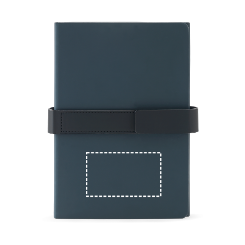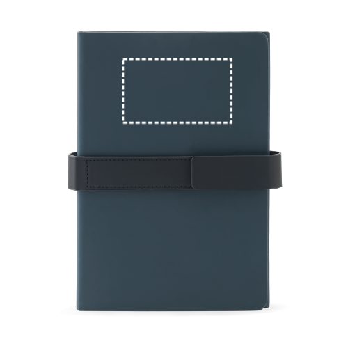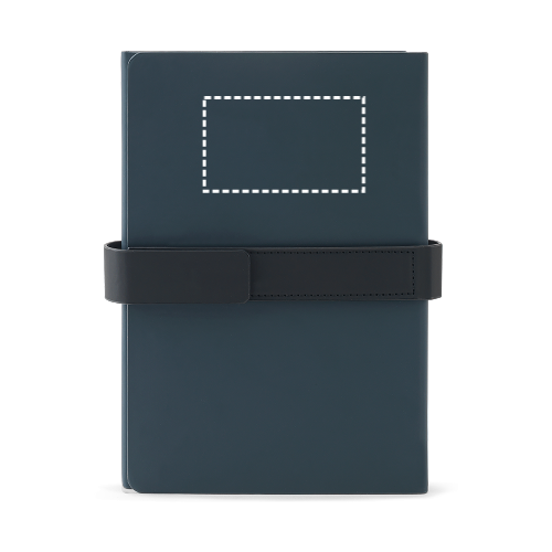 A5-Notizbuch mit modernem Design, das für Vielseitigkeit im Arbeitsalltag konzipiert wurde. Es besteht aus einem festen Einband aus 80 % recycelten Materialien (recyceltem Polyester und recyceltem PU) und ist in zwei Blöcke unterteilt: der erste mit 128 liniertem Seiten, der zweite mit 128 blanken Seiten (70 g/m²) – beide aus FSC™-zertifiziertem und anderem kontrollierten Material. Das Notizbuch verfügt über ein Band mit Magnetverschluss. 150 x 210 mm