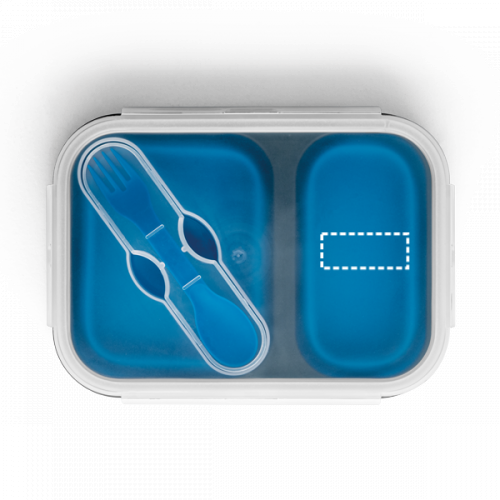 Faltbare hermetische Frischhaltebox aus Silikon und PP mit zwei Einteilungen. Kapazität bis zu 480 mL und 760 mL. Auf dem Deckel befindet sich ein Fach mit einem 2-in-1 Besteck, bestehend aus Gabel und Löffel (im Lieferumfang enthalten). Die Frischhaltebox ist für den Mikrowellengebrauch geeignet, wobei der Deckel vorher entfernt werden muss. 212 x 153 x 73 mm | Gefalten: 212 x 153 x 38 mm