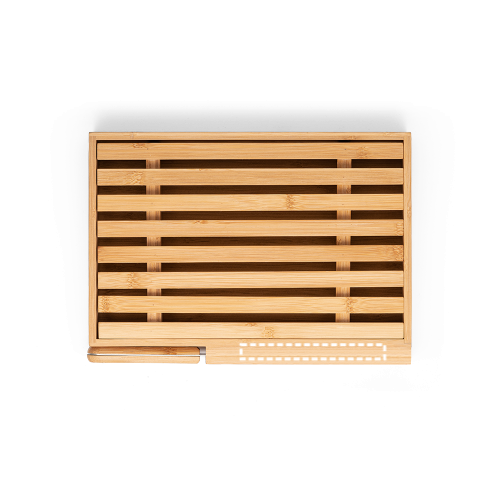Brotbrett aus Bambus mit Messer aus Edelstahl. Das Brett hat ein abnehmbares Gitter, um Krümel leicht zu entfernen. Geliefert in einer Geschenkschachtel aus Kraftpapier. Da das Produkt aus natürlichen Materialien hergestellt wird, können Farbe des Produkts sowie das Druckergebnis von Produkt zu Produkt unterschiedlich sein. 350 x 250 x 40 mm