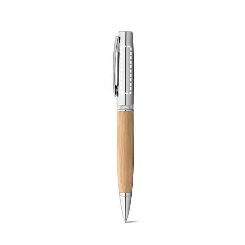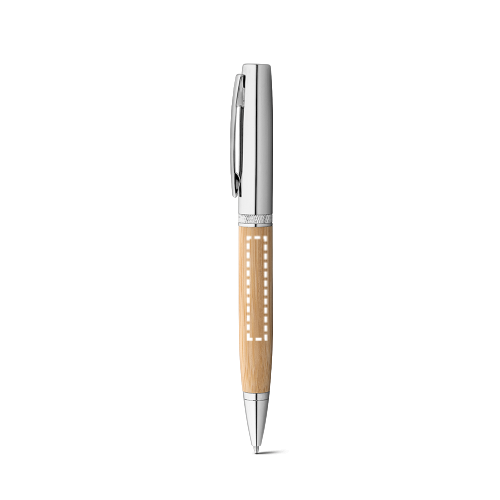 Kugelschreiber aus Bambus und Aluminium mit einer metallischen matten Oberfläche. Drehmechanismus und Clip aus Metal. Blauschreibende Mine. Geliefert in einem Geschenketui aus Kraftpapier. Da das Produkt aus natürlichen Materialien hergestellt wird, können Farbe des Produkts sowie das Druckergebnis von Produkt zu Produkt unterschiedlich sein. Kugelschreiber: Ø12 x 136mm | Schachtel: 23 x 155 mm