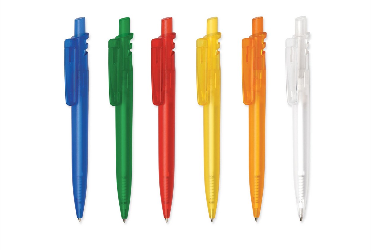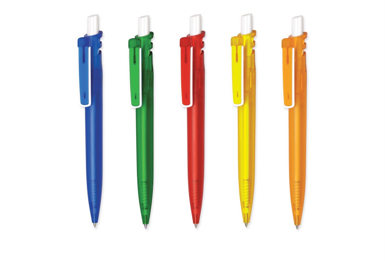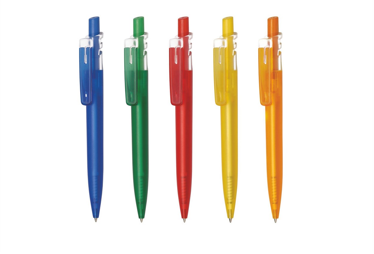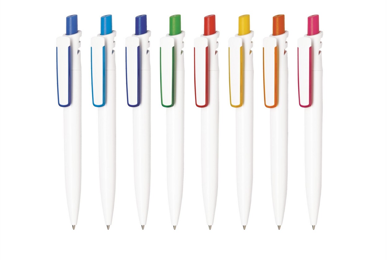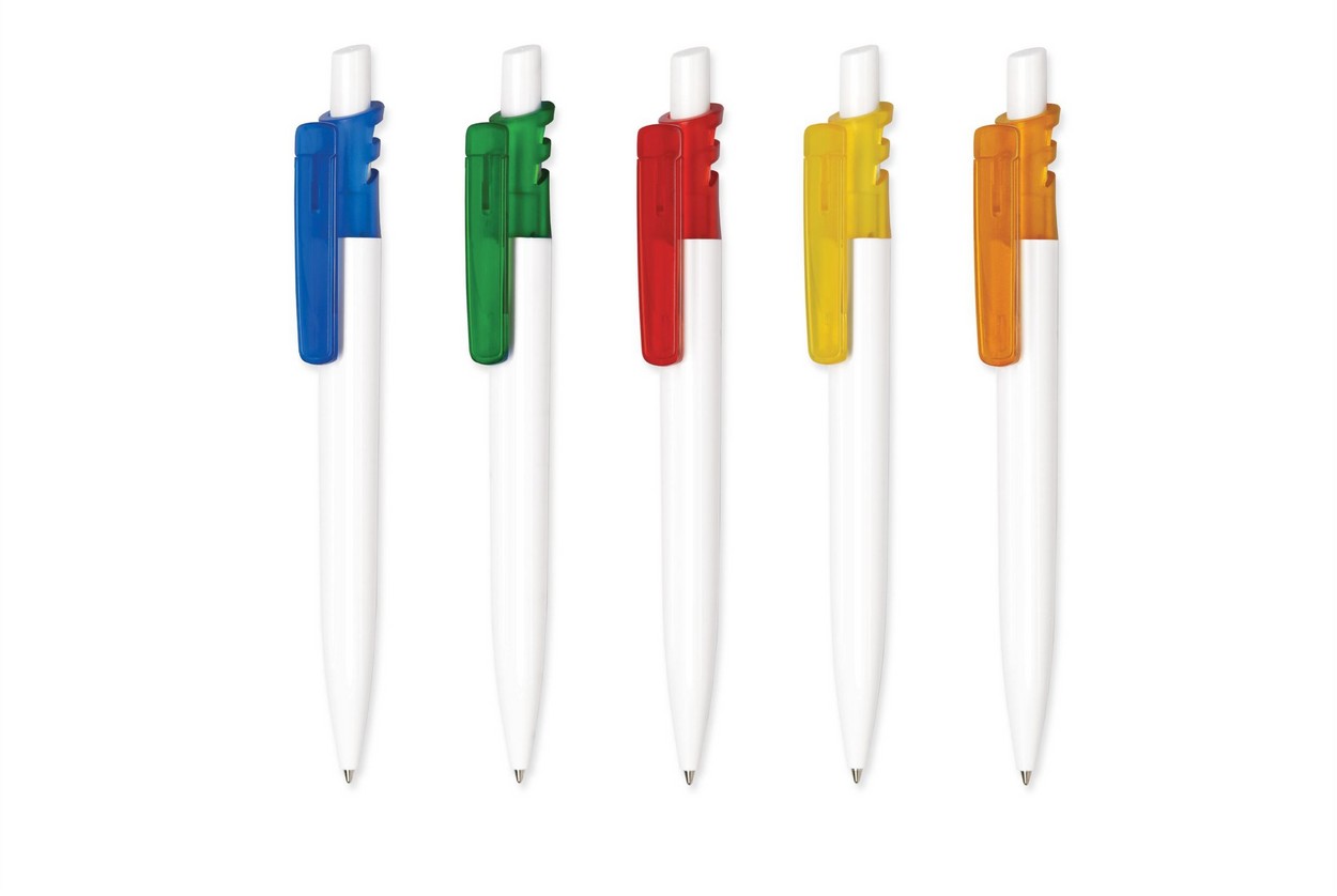 Grand Bright: Farbig-transparenter Schaft, Druckknopf und Lasche, weiß-transparenter Clip