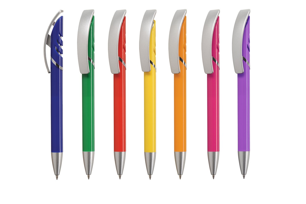 Color: Farbiger Schaft, silberner Clip, silberne Spitze, verchromter Metallring und Füllung