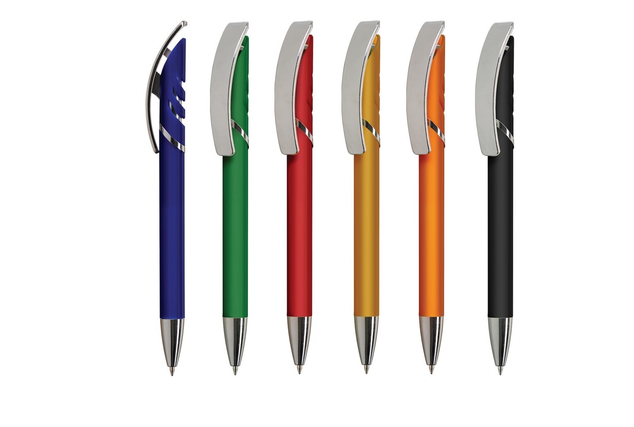 Lux: Farbige Softbeschichtung auf dem Schaft, silberner Clip, silberne Spitze, verchromter Metallring und Füllung