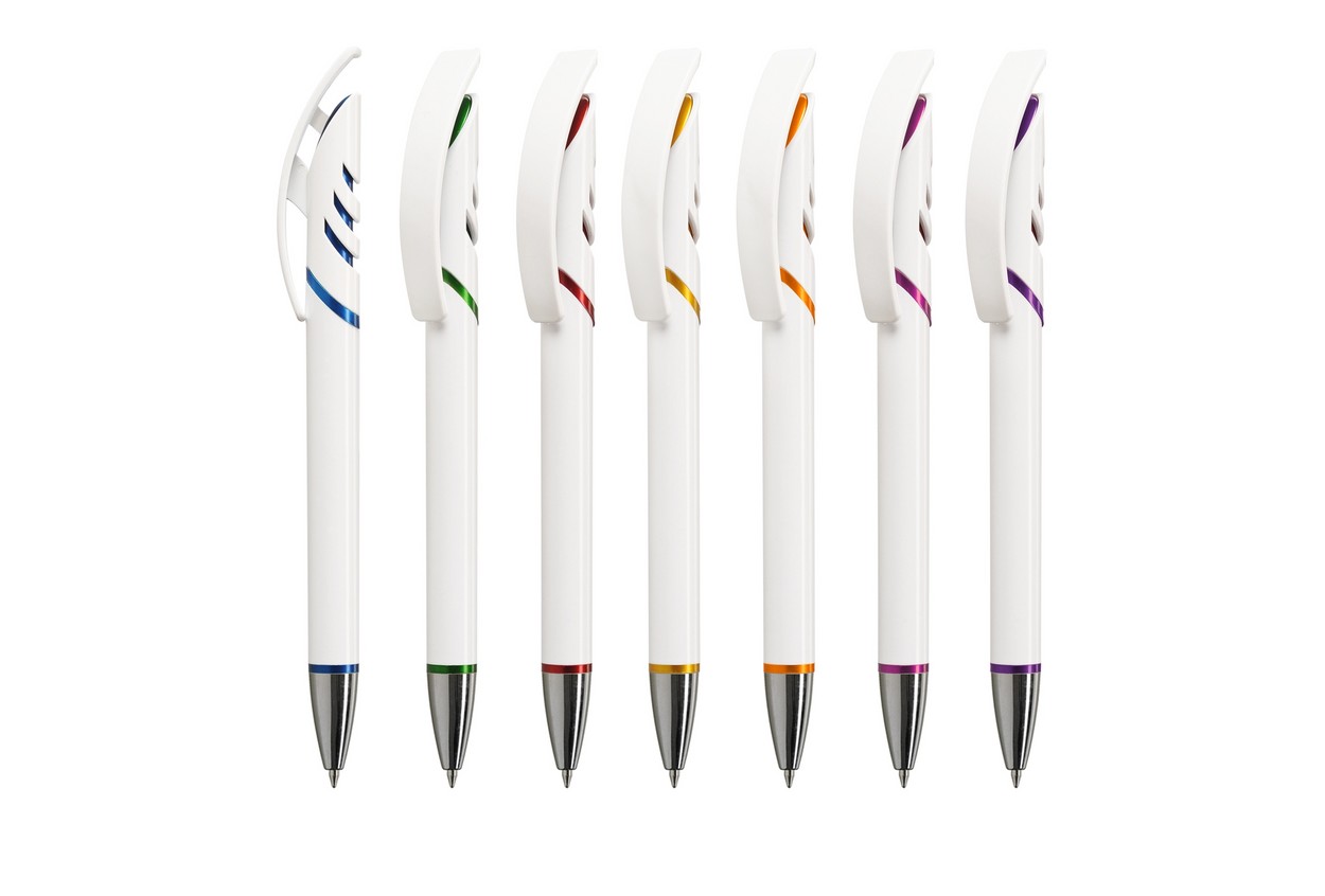 White: Weißer Schaft, farbiger Clip, silberne Spitze, verchromter Metallring und Füllung